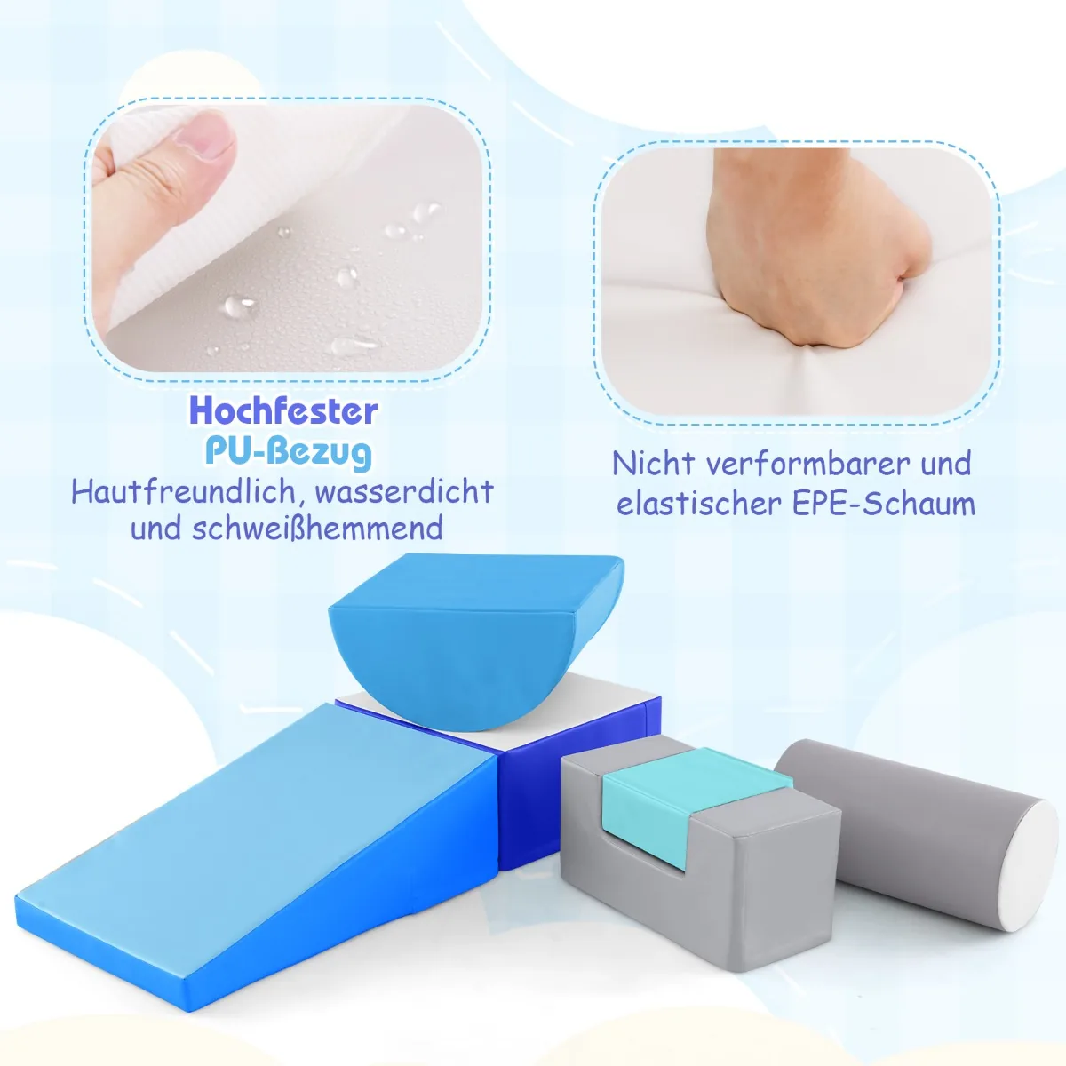 - Minkšti blokai užpildyti elastingomis EPE putomis, užtikrinančiomis amortizaciją ir saugumą.