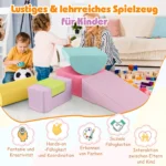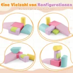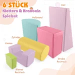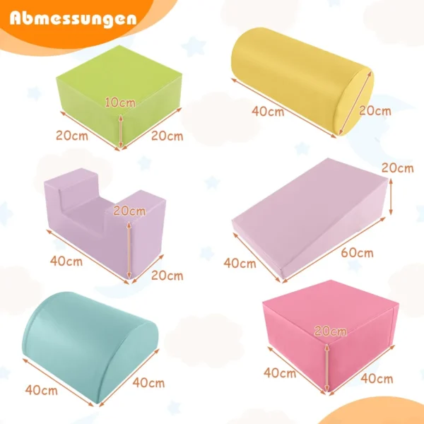 Rinkinys iš 6 statybinių kaladėlių įvairių spalvų skirtas mažyliams lavinti kūrybiškumą, motoriką ir spalvų atpažinimą. Šios minkštos, lengvos ir saugios kaladėlės pagamintos iš EPE putų ir PU dangtelio, tinkamos žaidimams namuose ar darželyje.