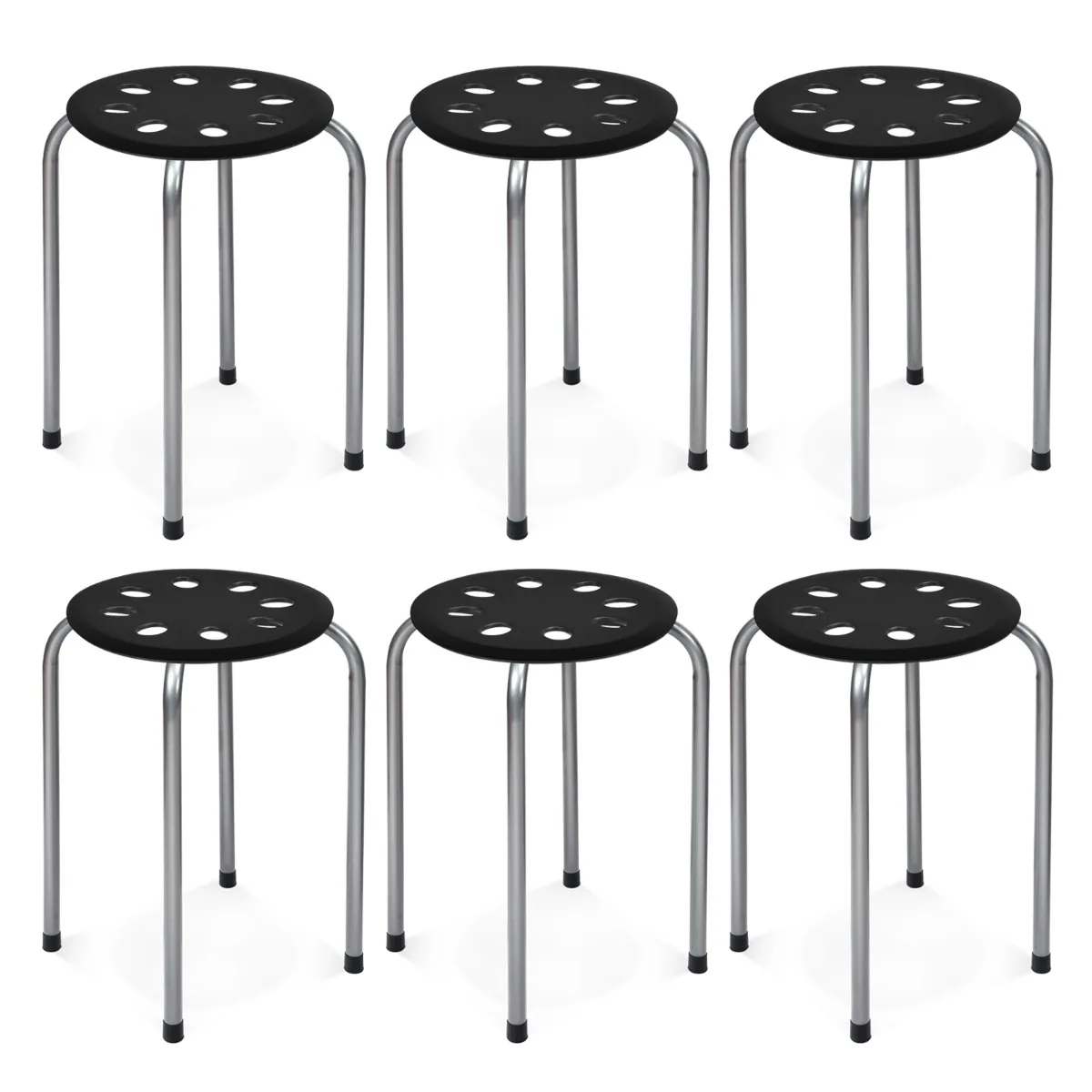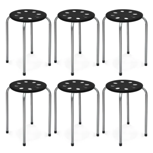 Rinkinys iš 6 sukraunamų metalinių taburečių 30x30x44,5 cm juodos ir sidabrinės spalvos tinka įvairioms patalpoms, kur reikalingos kompaktiškos ir patvarios sėdimos vietos. Taburetės pagamintos iš metalo ir PP medžiagos, todėl užtikrina ilgaamžiškumą bei patogumą kasdieniam naudojimui.