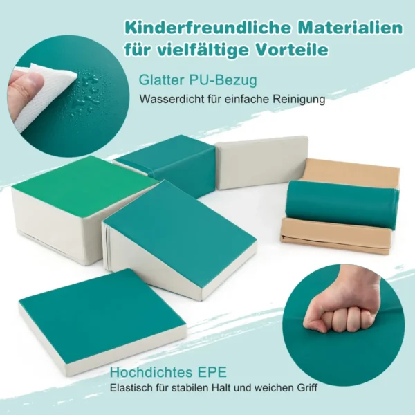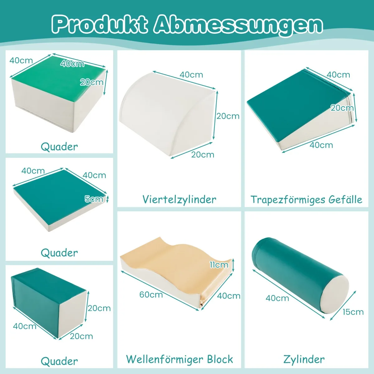 - 7 dalių putplasčio blokų rinkinys: ketvirčio cilindras, nuolydis, cilindras, bangų blokas ir trys stačiakampiai.