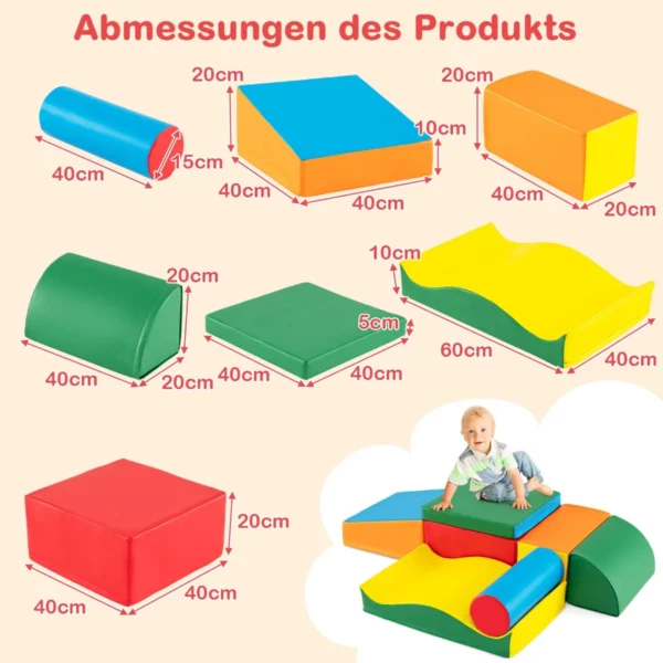 - 7 dalių laipiojimo žaidimų rinkinys su skirtingo dizaino ir spalvų kaladėlėmis.
