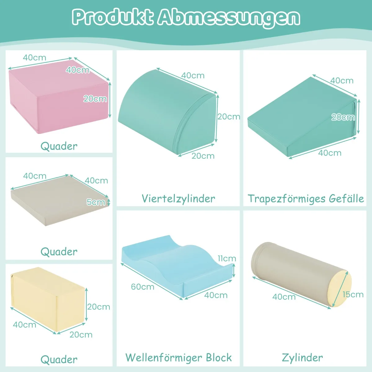 - 7 dalių putplasčio blokų rinkinys su skirtingomis formomis: stačiakampiai, ketvirčio cilindras, bangų blokas, nuolydis ir cilindras.