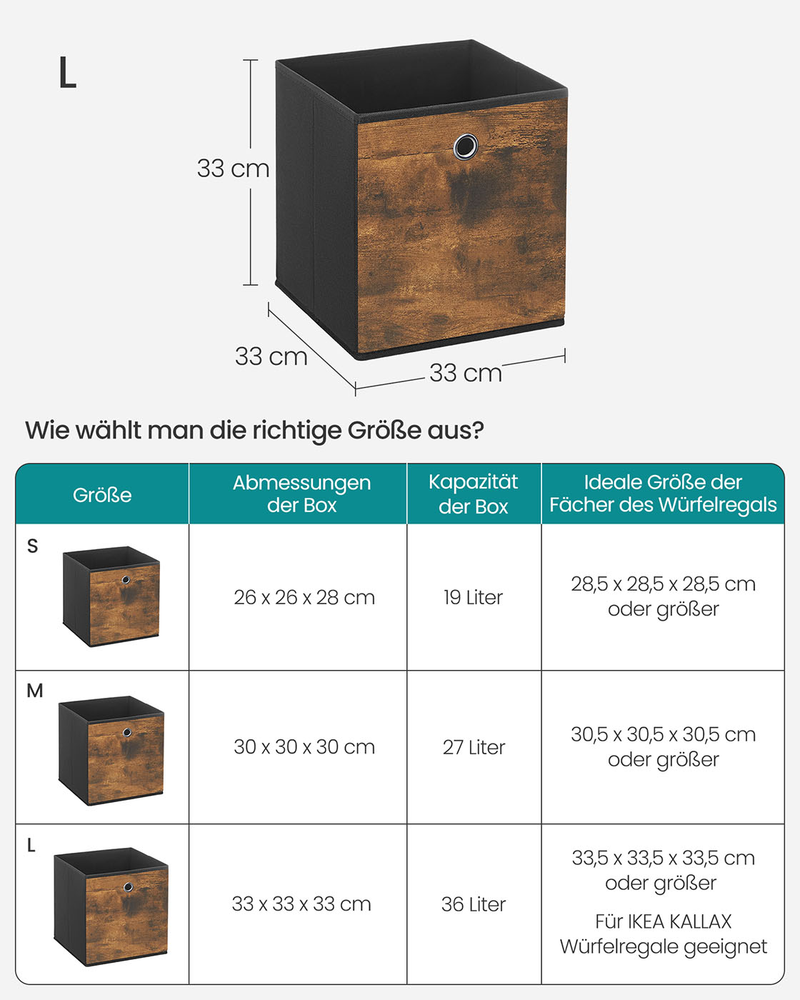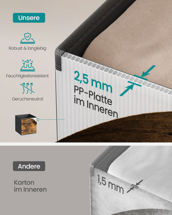 Pagamintos iš aukštos kokybės neaustinio audinio, Oksfordo audinio ir PP plastiko (polipropileno), šios dėžutės yra tvirtos ir ilgaamžės. Kiekvienos dėžutės dydis yra 33 x 33 x 33 cm, o bendras rinkinio svoris siekia 3,8 kg.