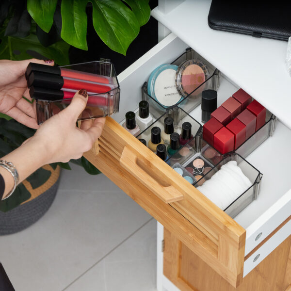 - Universalumas: Naudokite dėžutes miegamajame kojinėms ir apatiniams, kosmetikos gaminiams ant tualetinio staliuko ar smulkiems indams hobio zonose ir dirbtuvėse.
