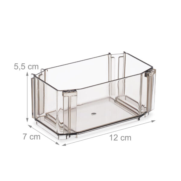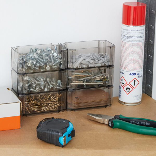 - Erdvės taupymas: Dėžutės gali būti sukrautos viena ant kitos arba įkištos viena į kitą, sudarant stabilų korio tinklelį, kuris padeda sutaupyti vietos.