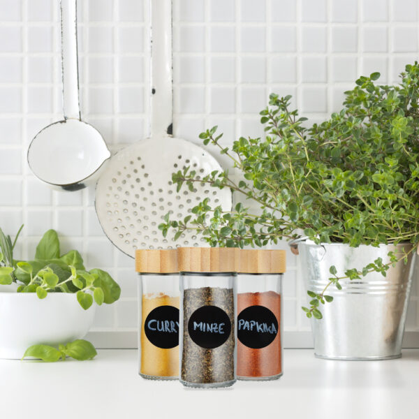 • Personalizacija: Ant apvalių indelių galite klijuoti užrašomas etiketes, kad reikiamų prieskonių būtų galima rasti kuo greičiau.