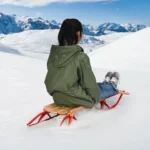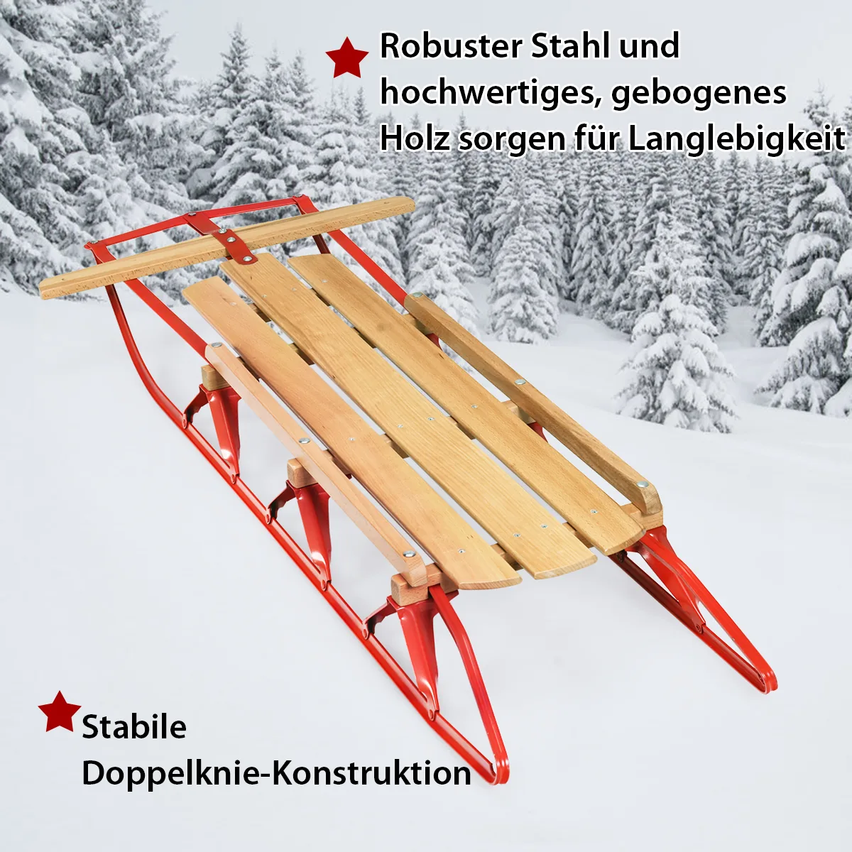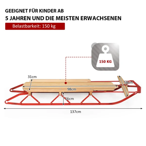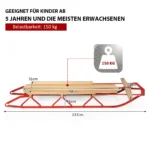Rogės 137x58x16cm, šviesiai rudos ir raudonos spalvos, skirtos įvairaus amžiaus vaikams ir suaugusiems. Tvirta medinė ir plieninė konstrukcija užtikrina ilgaamžiškumą ir patikimą valdymą sniego sąlygomis.