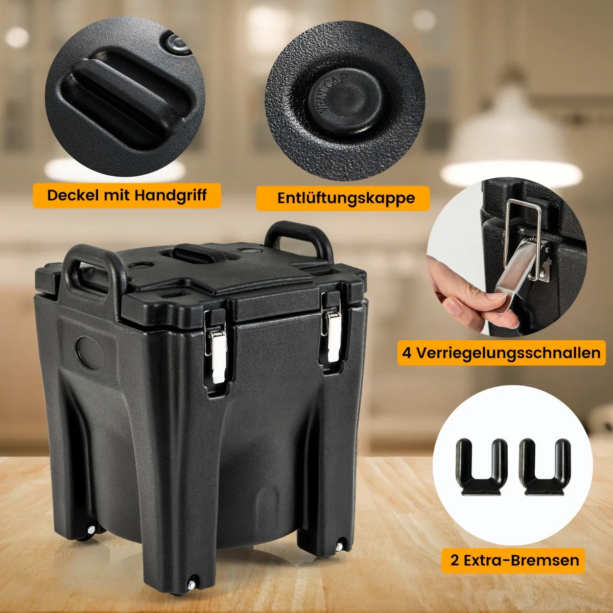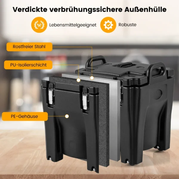 Šaltdėžė 44x44x53cm, juodos spalvos, yra skirta maisto ir gėrimų laikymui bei transportavimui. Dėl 3 sluoksnių izoliacinės konstrukcijos ji išlaiko maistą karštą arba šaltą iki 6 valandų. Praktinės rankenos ir ratukai užtikrina patogumą naudojant įvairiose situacijose, pavyzdžiui, banketuose, vakarėliuose ar stovyklavime.