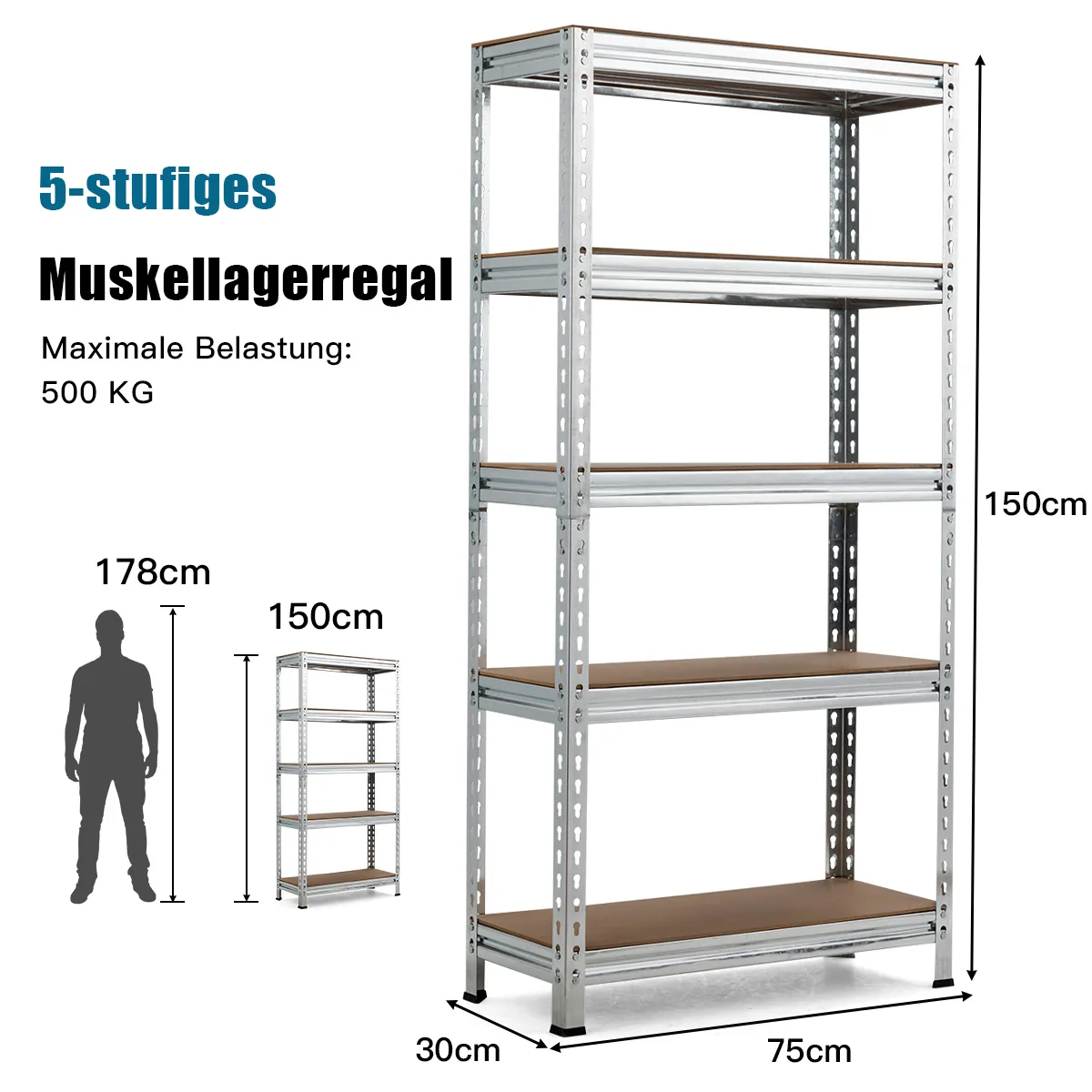 Sandėliavimo lentyna 150x75x30cm., šviesiai rudos ir sidabrinės spalvos, skirta patogiam įvairių daiktų laikymui namuose ar garaže. 5 pakopų lentyna pagaminta iš metalo ir MDF plokščių, užtikrinanti didelį patvarumą bei tvirtumą, lengvai pritaikoma pagal saugojimo poreikius.