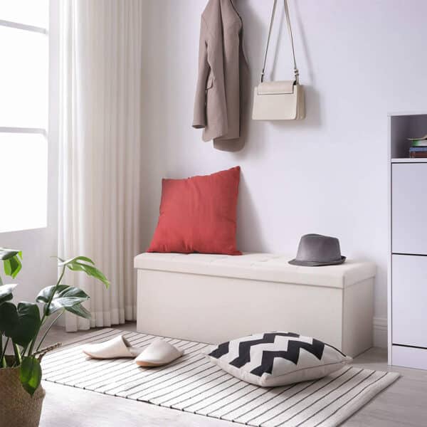 Ši SONGMICS daiktadėžė puikiai papildys jūsų namų apstatymą. Išmanaus dizaino dėžutė tinka įvairiems tikslams ir tarnauja kaip praktiškas batų suoliukas, lovos skrynia ar papildoma sėdima vieta svetainėje, ypač mažesniuose butuose. Jauskitės patogiai ant minkšto suoliuko apmušalo ir perbraukite ranka per patogų lino užvalkalo imitaciją. Ne tik ši daiktadėžė yra itin patvari, bet ir visa konstrukcija pagaminta iš aukštos kokybės medžio dulkių plokštė (MDF), kurio maksimali statinė apkrova siekia 300 kg.