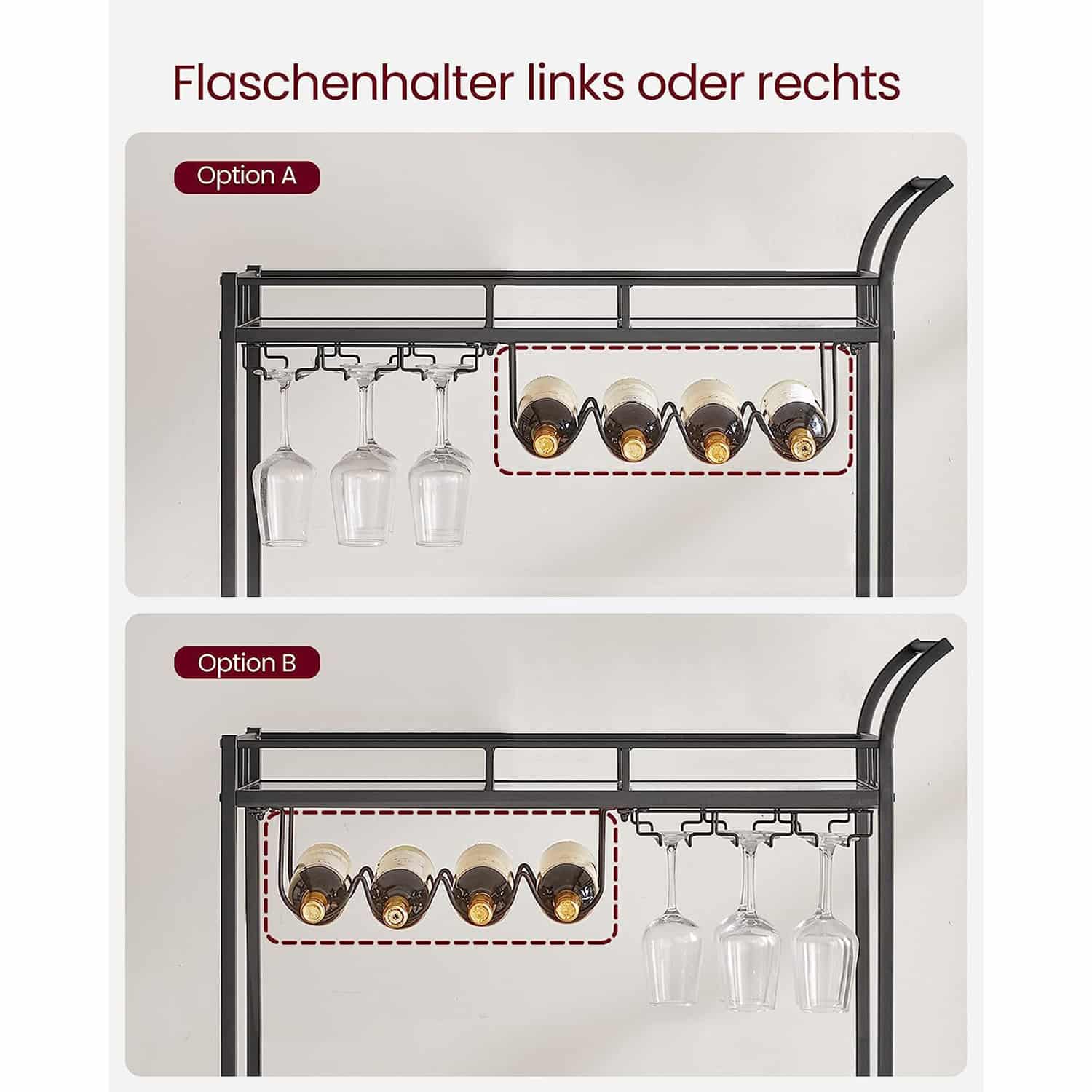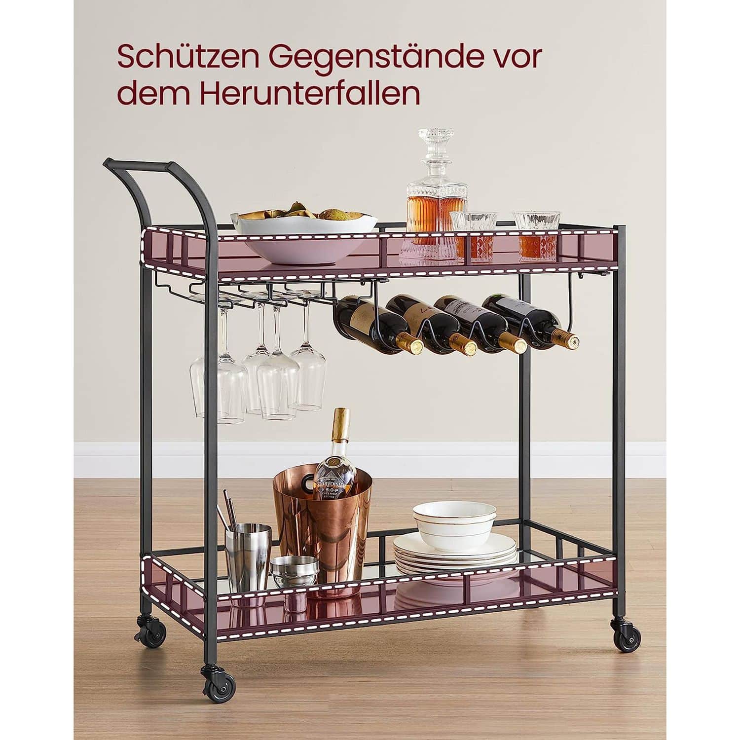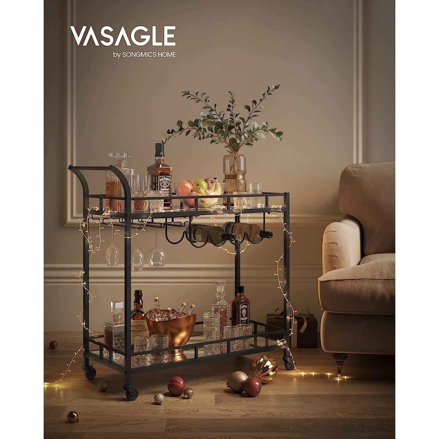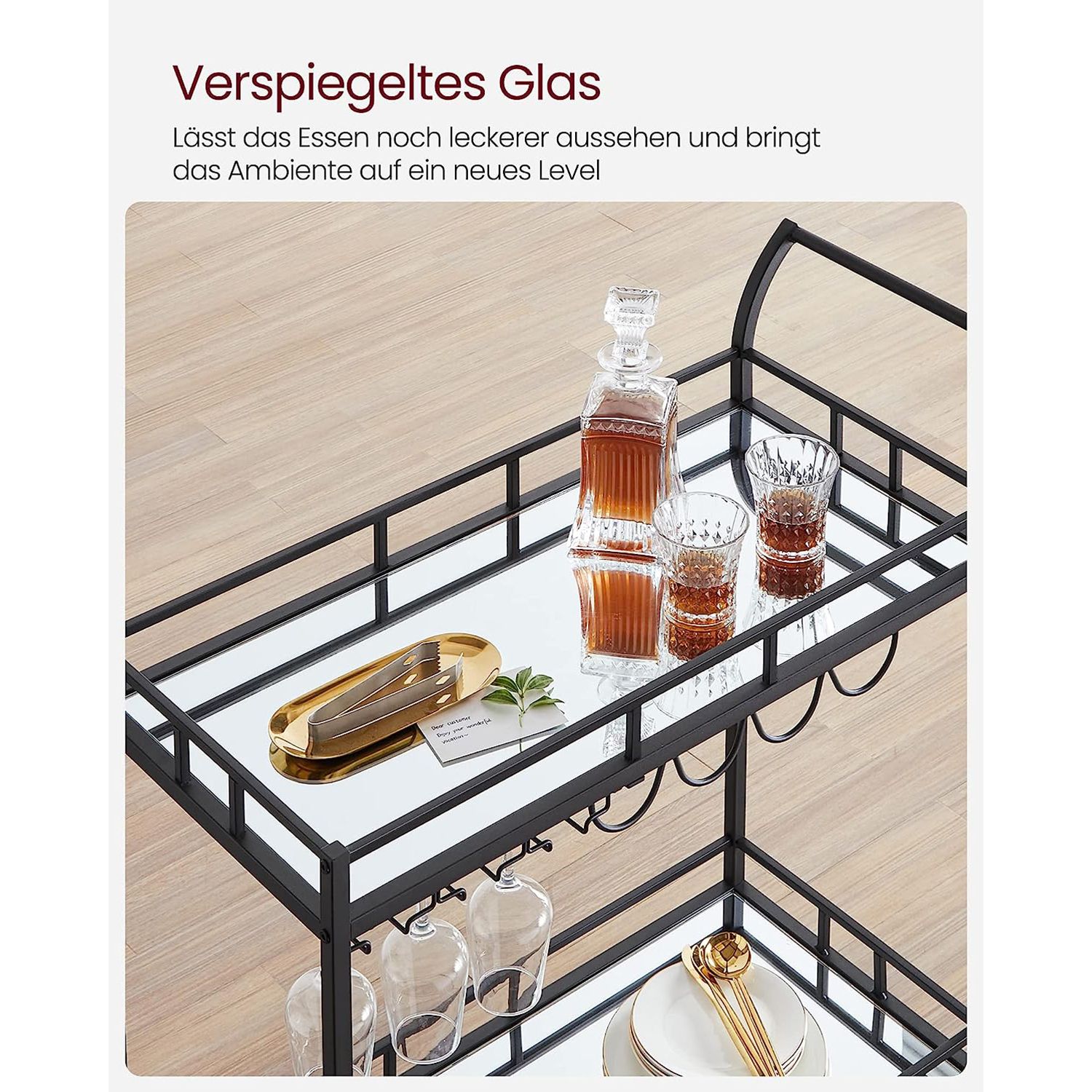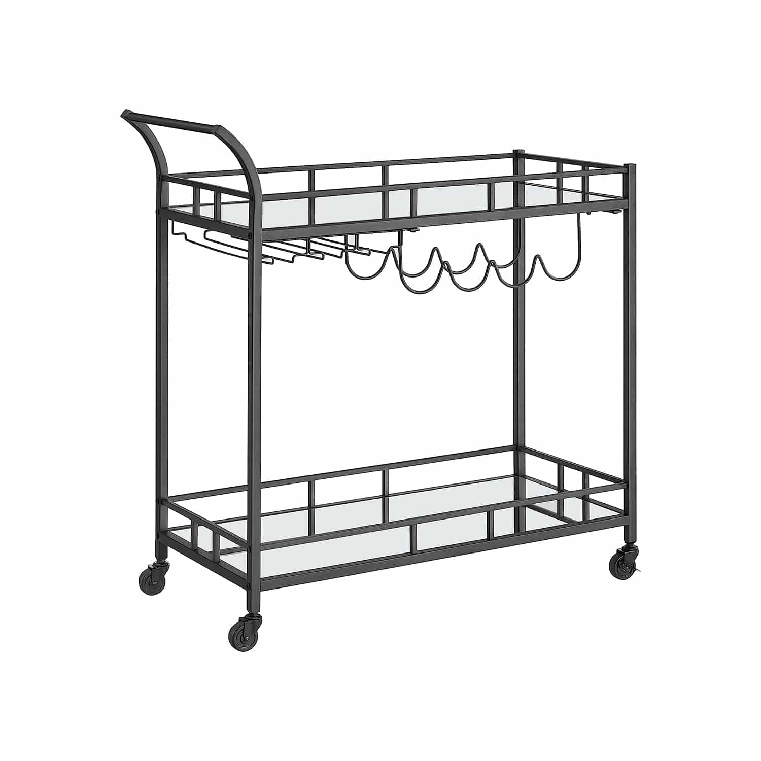 Serviravimo vežimėlis ant ratukų su 2 veidrodinėmis stiklinėmis lentynomis, juodos spalvos