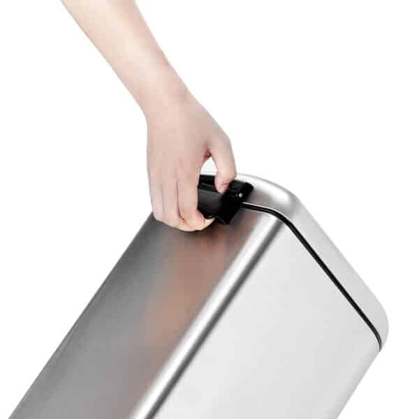 Lengva transportuoti ir ištuštinti: Šiukšliadėžės gale yra rankena, todėl ją galima lengvai transportuoti bet kur. PP plastikinė vidinė šiukšlių dėžė taip pat turi rankenas, todėl galite lengvai ją ištraukti ir ištuštinti.