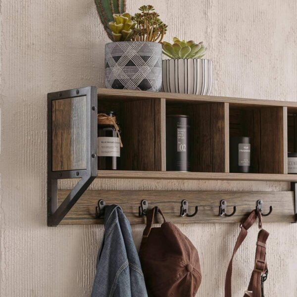 Pagaminta iš aukštos kokybės MDF (E1) ir metalo, ši kabykla yra tvirta ir ilgaamžė. Ji turi 4 atvirus skyrius, kuriuose galite laikyti knygas, telefonus, kolekcionuojamus daiktus, ornamentus ir kitus smulkius daiktus. Be to, kabykla turi 5 kablius, skirtus krepšiams, paltams, skėčiams, papuošalams ir raktams kabinti.