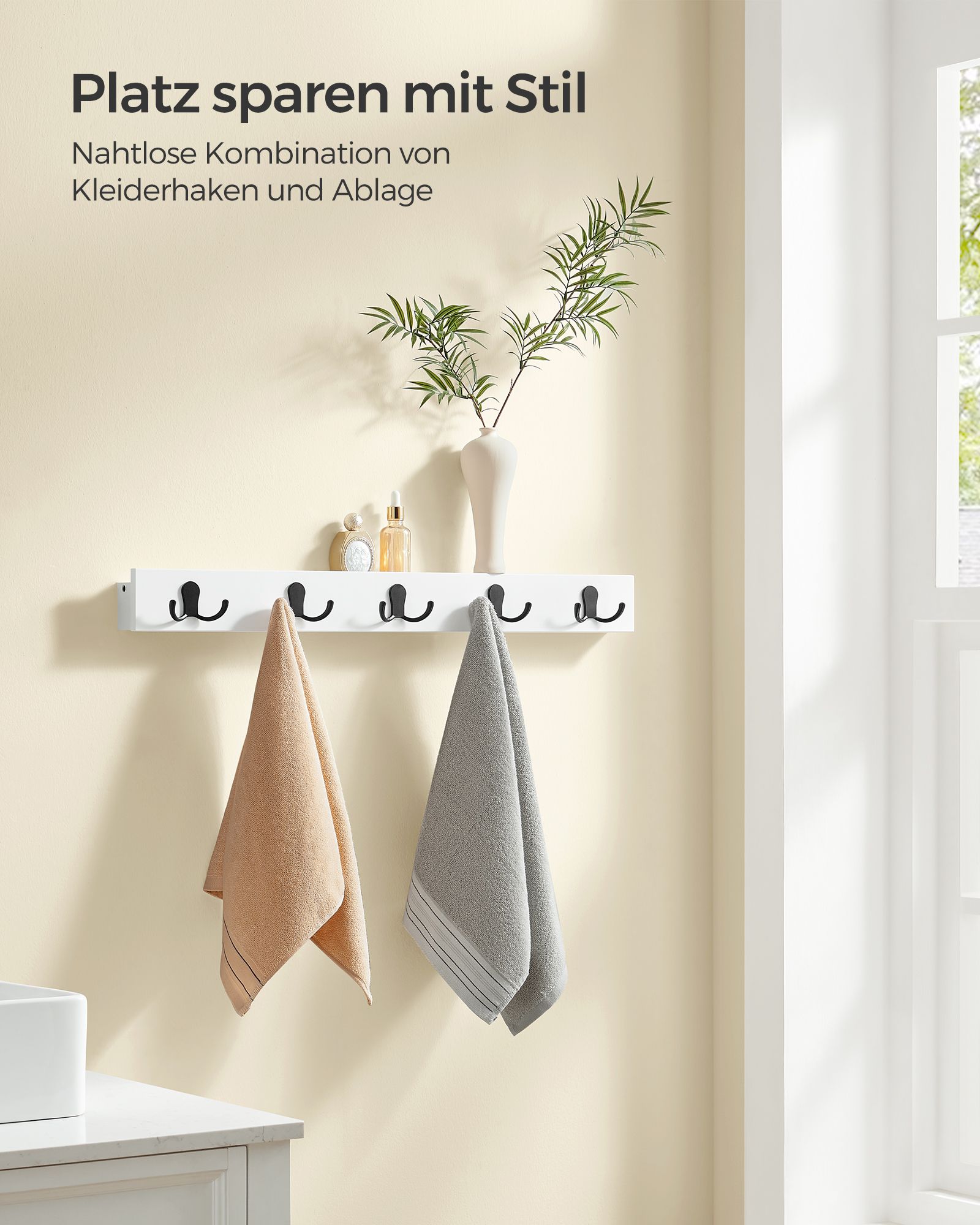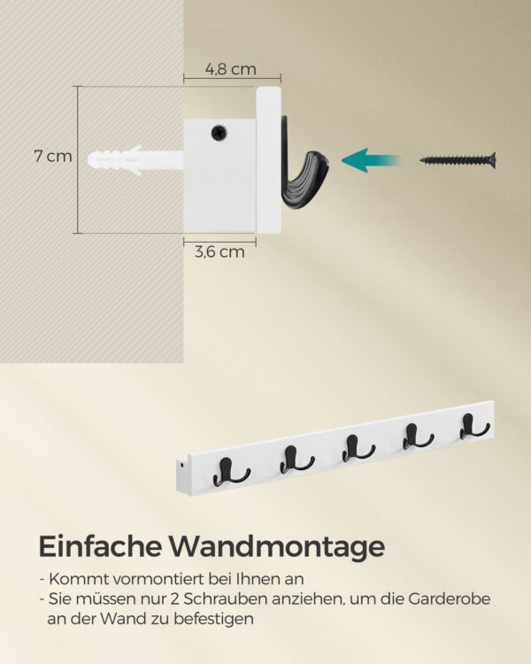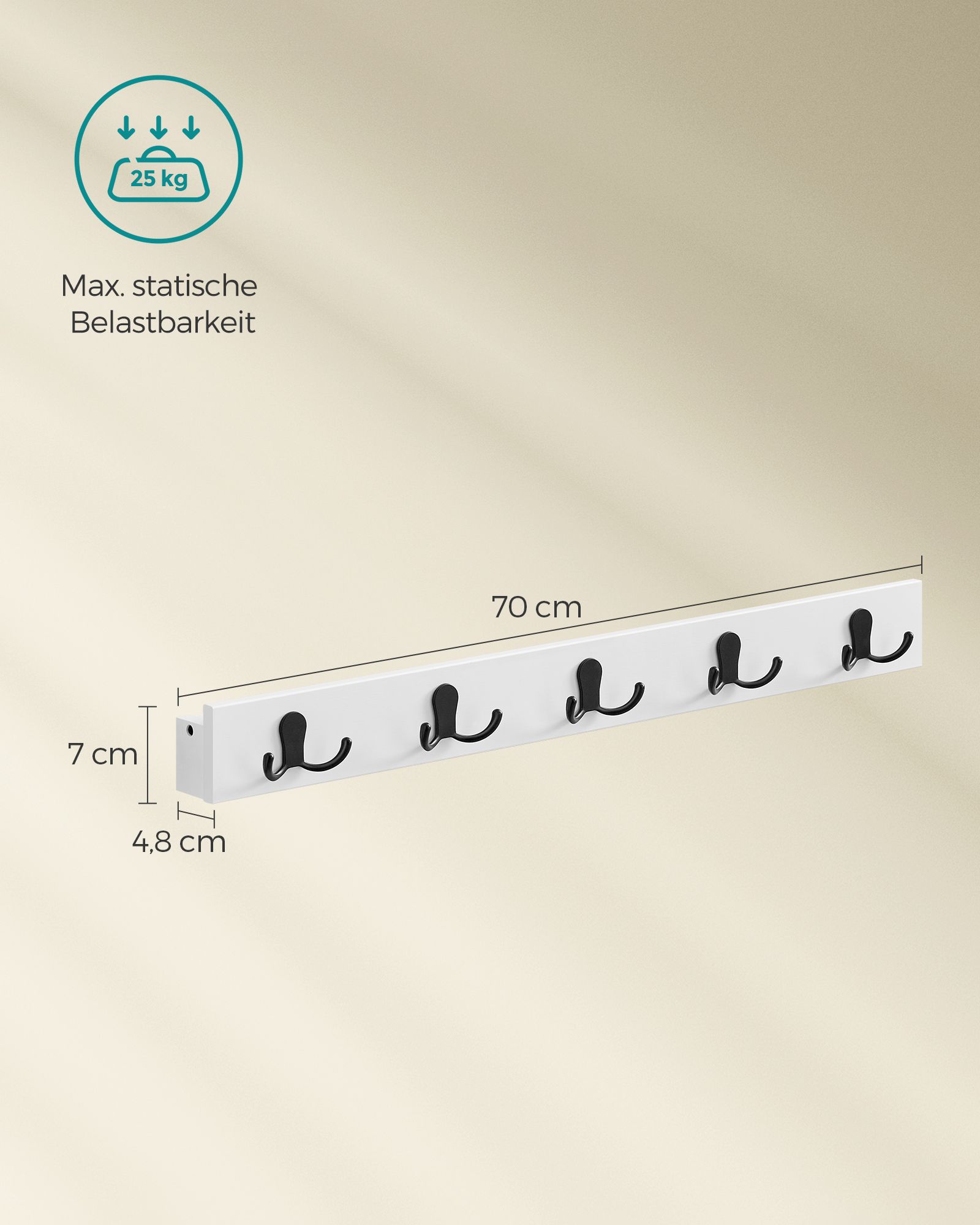 - Maksimali statinė apkrova vienam kabliui: 5 kg – tinka įvairiems drabužiams ir aksesuarams.