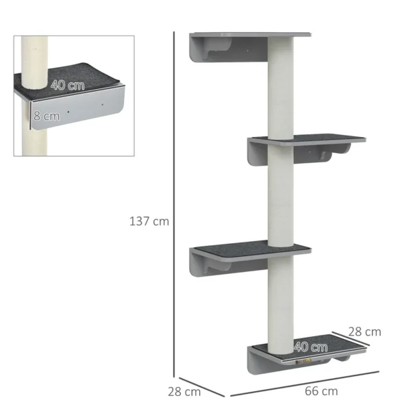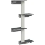 PawHut kačių medį galima montuoti ant sienos, jį sudaro 4 nardymo lentos ir 2 kačių medžiai. Tvirta konstrukcija pagaminta iš MDF medienos ir minkšto kilimo viršaus. Katės gali žaisti, šokinėti ir ilsėtis ant 4 platformų. Džiuto stulpelis suteikia jūsų katei galimybę pagaląsti nagus ir taip apsaugo jūsų baldus nuo nepageidaujamų įbrėžimų. Šis stulpelis ant sienos yra ideali vieta miegoti ir žaisti jūsų katėms.