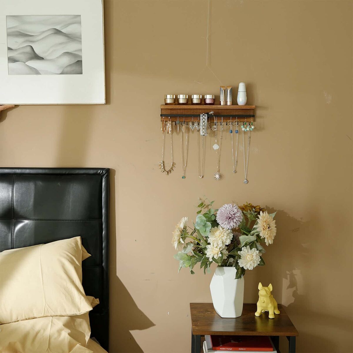 Čia susirenka visi papuošalai: jūsų papuošalai nori susiburti ir aptarti naują paskirtį. Ši sieninė lentyna su lentyna, geležiniu strypu, 16 kabliukų ir 26 angomis suteikia jiems puikią susitikimo vietą. Diskusijoje aktyviai dalyvauja karoliai, apyrankės, auskarai, net nagų lakas ir kvepalai. Tačiau jie nežino, kad jau atliko šį darbą. Šie daiktai, kaip ir pati lentyna, yra stilingi dekoratyviniai elementai, kurie pagyvins tuščias sienas jūsų namuose.