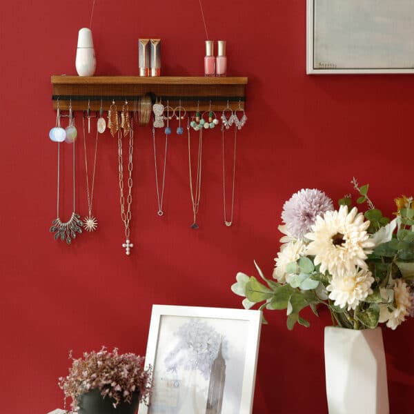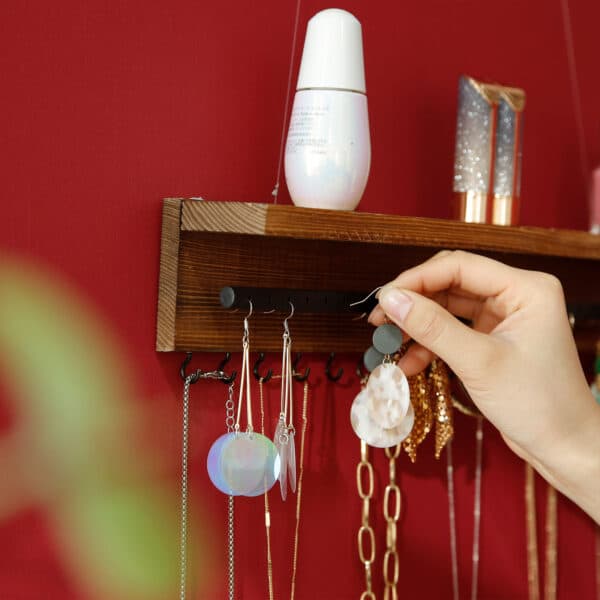 Sienos taip pat nori būti gražesnės: šis papuošalų laikiklis sujungia funkcionalumą ir estetiką. Tamsiai rudos ir juodos spalvų derinys suteikia jūsų namams ypatingą akcentą. Tvirta medinė konstrukcija ir patikimas geležinis strypas užtikrina stabilų jūsų vertybių laikymą. Leiskite veikti savo vaizduotei ir suteikite papuošalams (kai jie nenaudojami) naują paskirtį: papuoškite tuščias sienas kartu su šia lentyna!