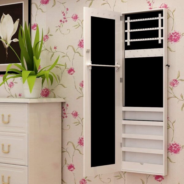 Su daugybe skirtingų kabliukų, skyrių ir lentynėlių, papuošalų spintelėje yra daug vietos žiedams, karoliais, laikrodžiams, apyrankėms ir kitiems jūsų lobiams. Tai užtikrina daugiau tvarkos ir apžvalgos. Spintelę prie sienos galima pritvirtinti be jokių problemų ir didelių pastangų. Priedai, reikalingi tvirtinimui prie sienos, yra įtraukti į pristatymo komplektą.