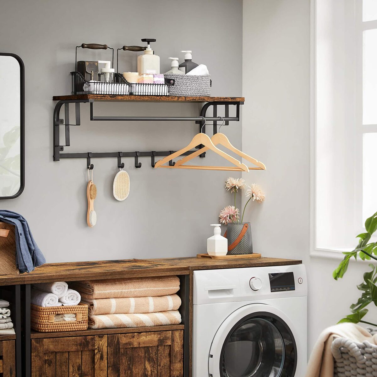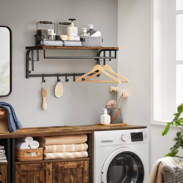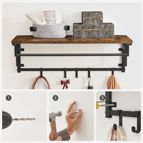 Ši sieninė rūbų kabykla su lentyna yra puikus sprendimas jūsų namams, suteikiantis tiek funkcionalumą, tiek stilingą išvaizdą. Ji pagaminta iš kokybiškų medžiagų, kurios užtikrina ilgaamžiškumą ir patikimumą.