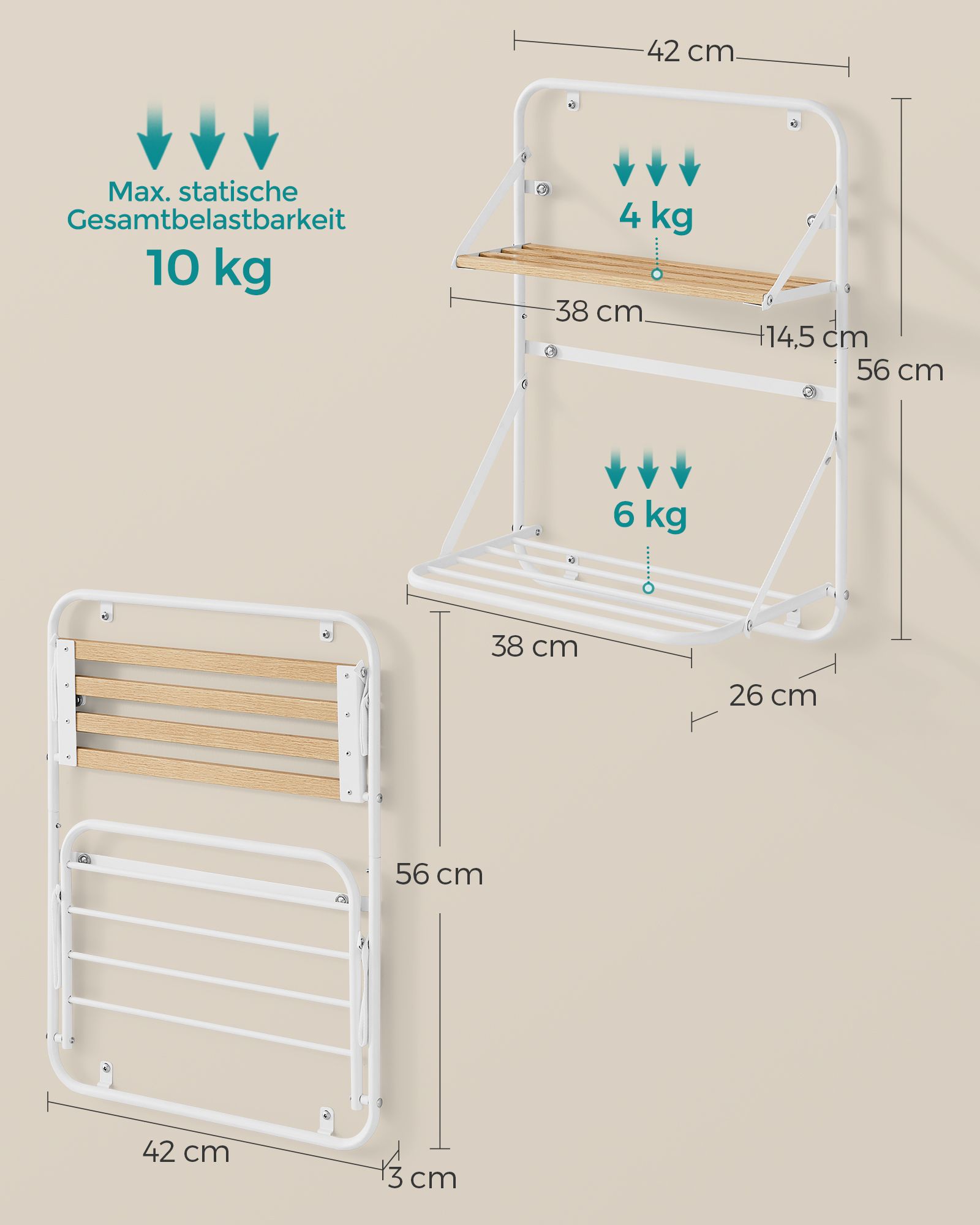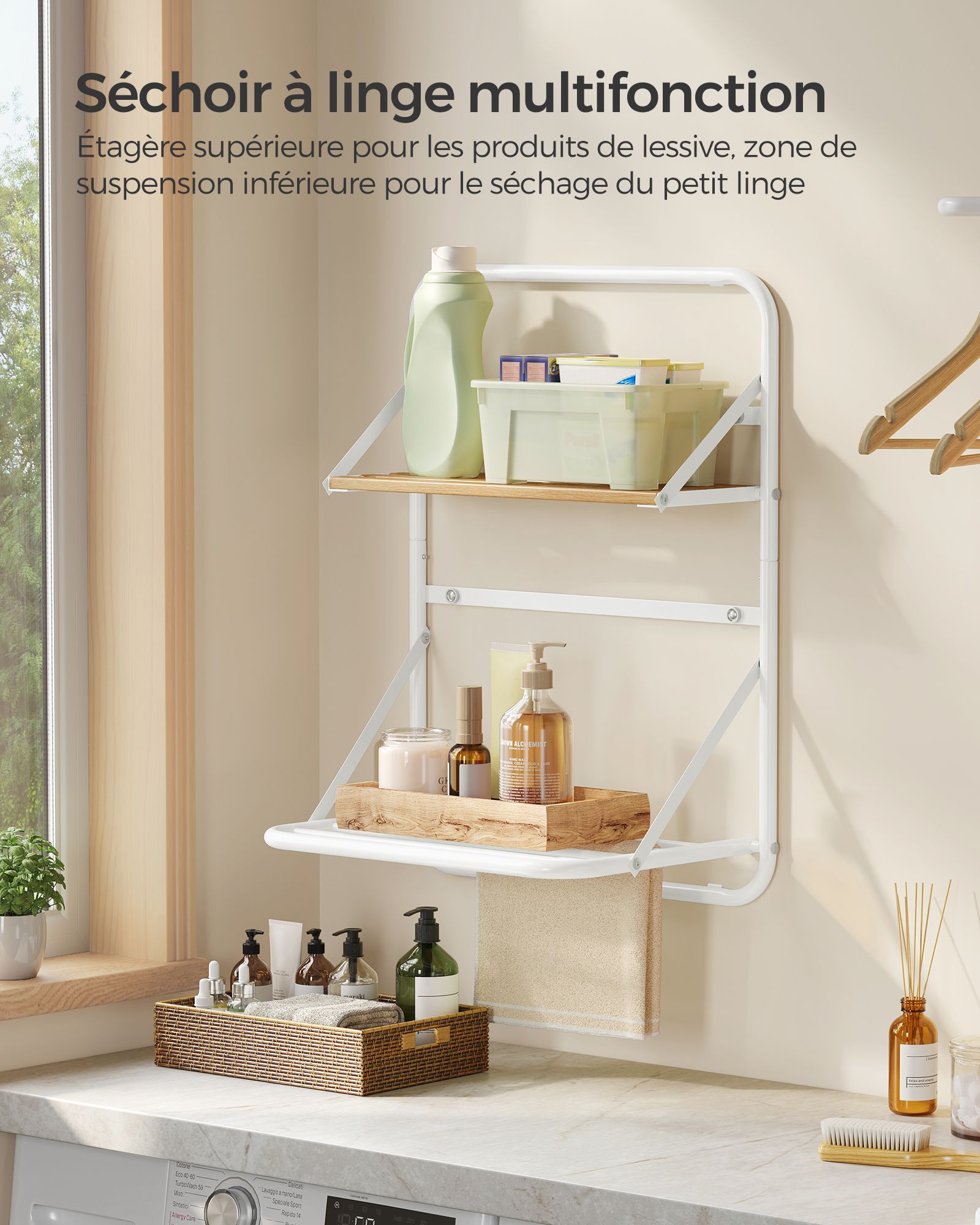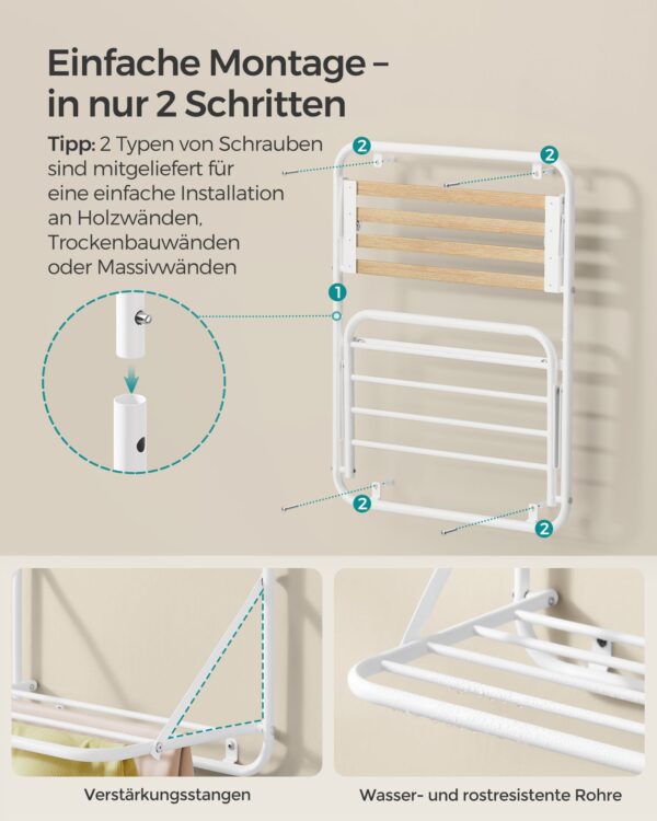 Ši sieninė džiovyklė yra puikus pasirinkimas tiems, kurie vertina praktiškumą ir stilių. Jos kompaktiškas dizainas leidžia sutaupyti vietos, o papildomos lentynos suteikia galimybę laikyti įvairius daiktus, tokius kaip skalbimo priemonės ar rankšluosčiai. Pasirinkite šią džiovyklę ir mėgaukitės patogumu bei tvarka savo namuose.