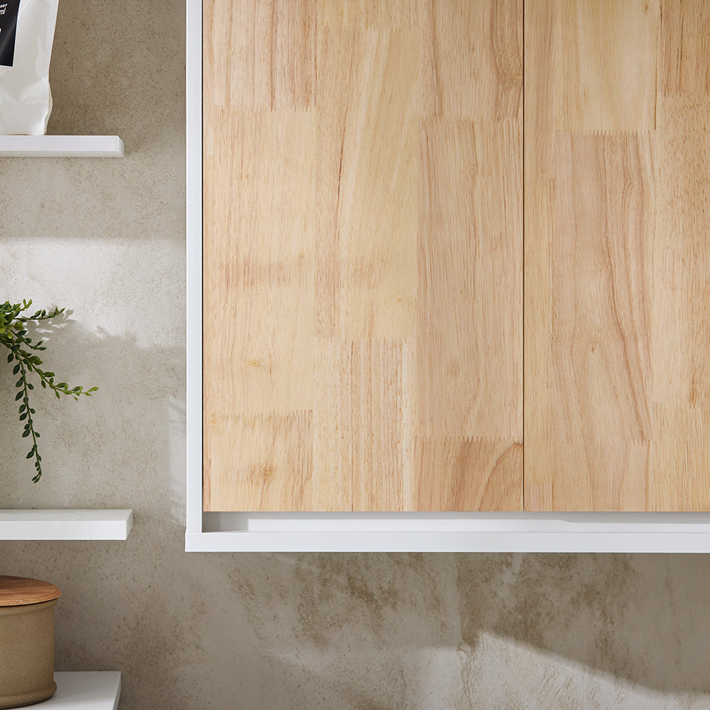 Pagaminta iš patvarios MDF (E1) medžiagos ir guminio medžio, ši spintelė yra stabili ir atspari įtrūkimams. Dėl sieninio montavimo ji efektyviai naudoja sienos plotą, neužimdama grindų vietos.