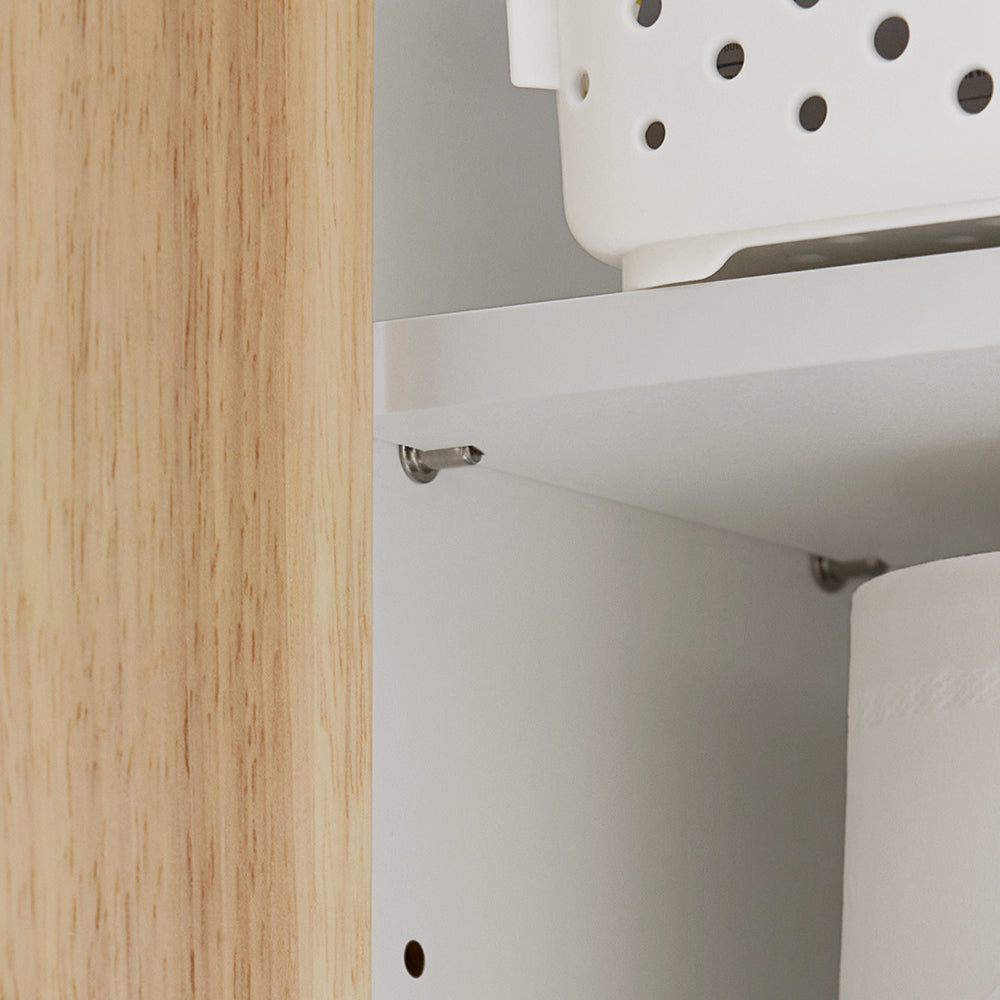 Šviesios ąžuolo spalvos MDF ir balto rėmo derinys pabrėžia šios vonios spintelės paprastą eleganciją, todėl ji lengvai dera su kitais baldais vonios kambaryje, miegamajame ar skalbykloje.