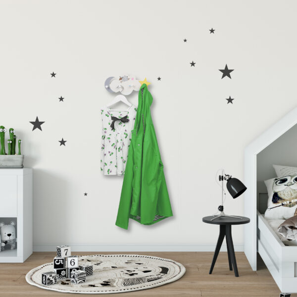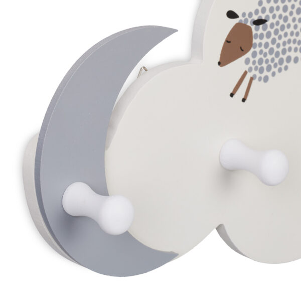 Kabliukų lentyna sukurta su mielu debesų, mėnulio ir žvaigždžių motyvu, kuris primena naktinį dangų. Šis dizainas neabejotinai privers vaikų širdeles plakti greičiau ir suteiks kambariui žaismingumo.