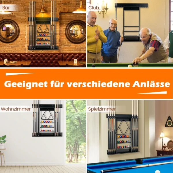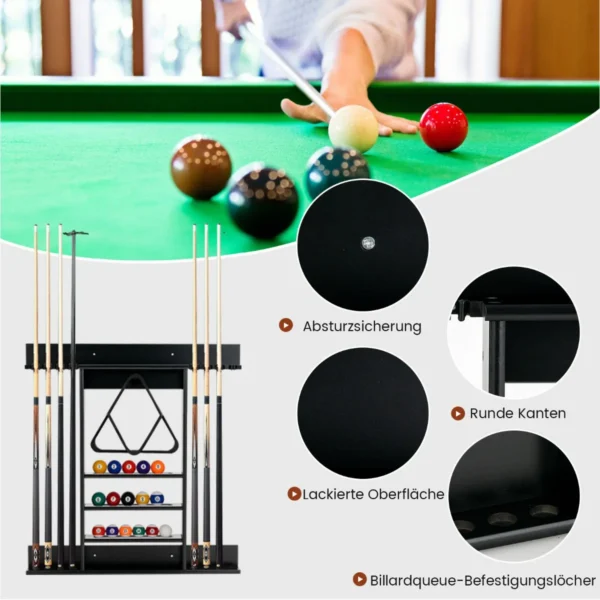 - Biliardo lazdų stovas turi 8 segtukus 8 lazdoms bei 3 pakopų lentyną 15 biliardo kamuoliukų.