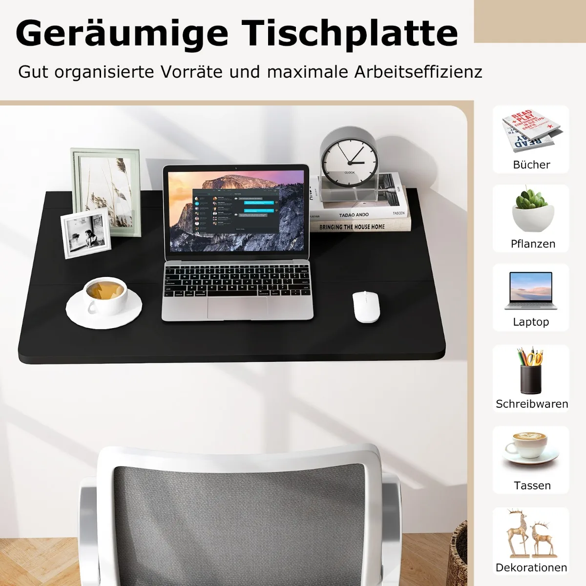 - Didelis 80 x 53 cm stalviršis leidžia patogiai laikyti nešiojamąjį kompiuterį ir darbo priemones.