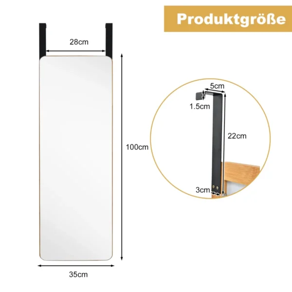 - Veidrodis pagamintas iš aukštos kokybės stiklo su nedūžtančia danga, rodantis aiškų atspindį visam kūno ilgiui (100×35 cm).