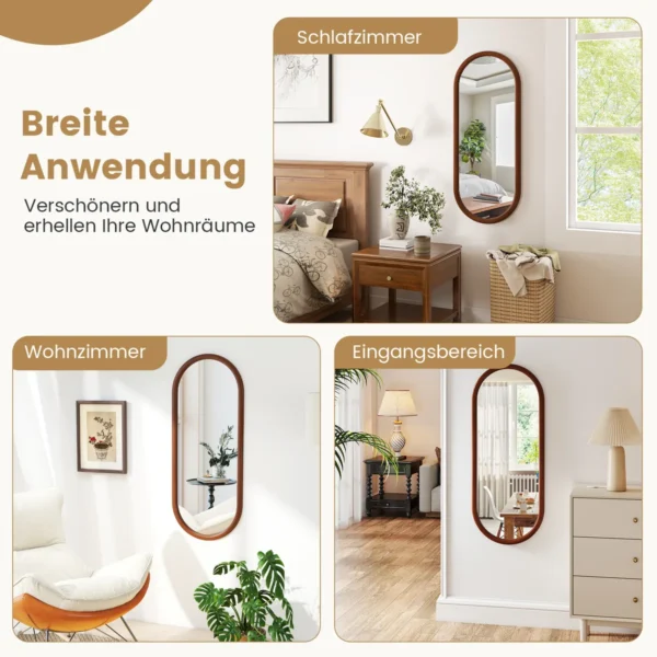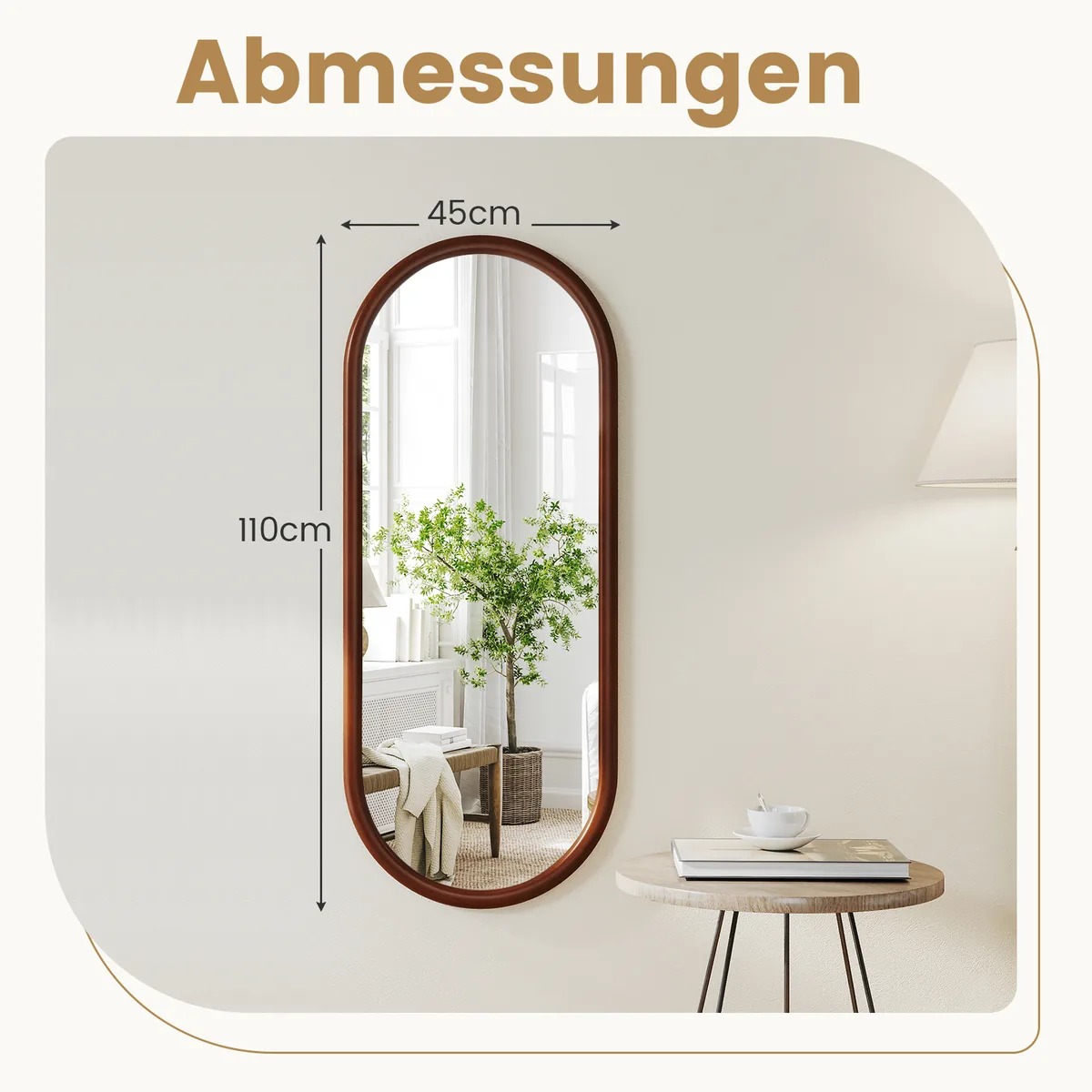 Sieninis veidrodis 110x45cm, rudos spalvos, puikiai tinka įvairioms gyvenamosioms erdvėms – nuo miegamojo iki prieškambario. Ovalus veidrodis su medžio masyvo rėmu suteikia natūralumo ir praktiškumo, o jo dydis užtikrina aiškų ir ryškų atspindį.