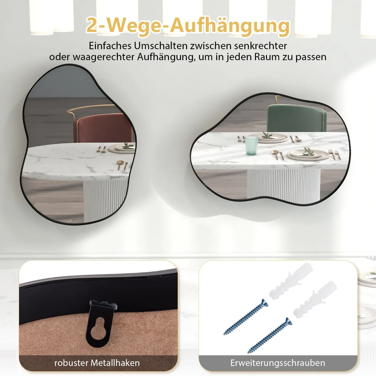 - Asimetriškas sieninis veidrodis su netaisyklinga forma, paryškinanti kambario interjerą.