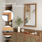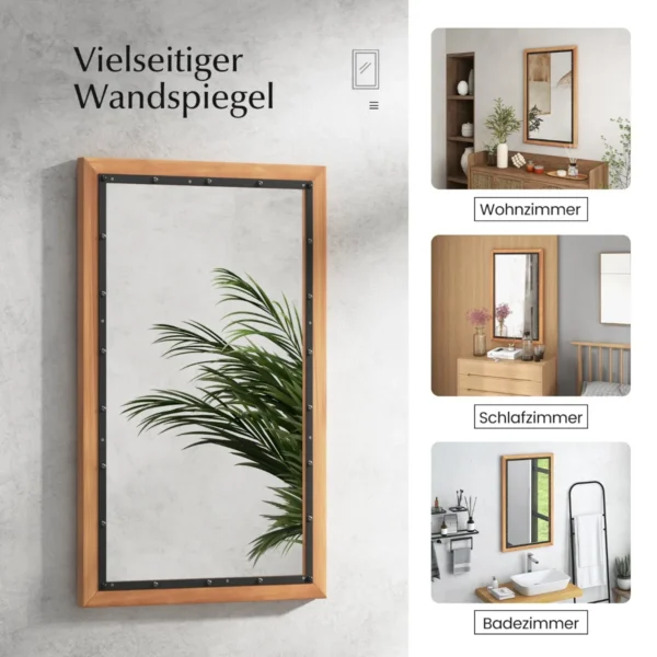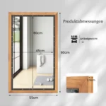 Sieninis veidrodis 55×90 cm, pagamintas iš natūralios medienos, metalo ir stiklo, puikiai tinka įvairiems interjerams. Šis stačiakampis veidrodis pasižymi tvirtumu ir funkcionalumu, tinkamas svetainėms, miegamiesiems ar vonios kambariams.