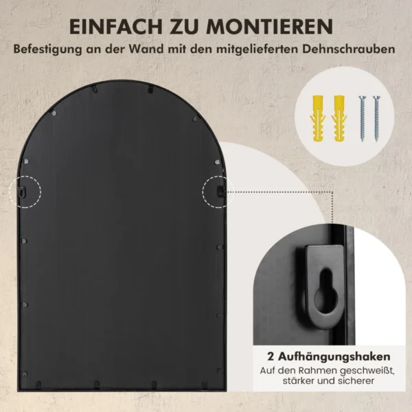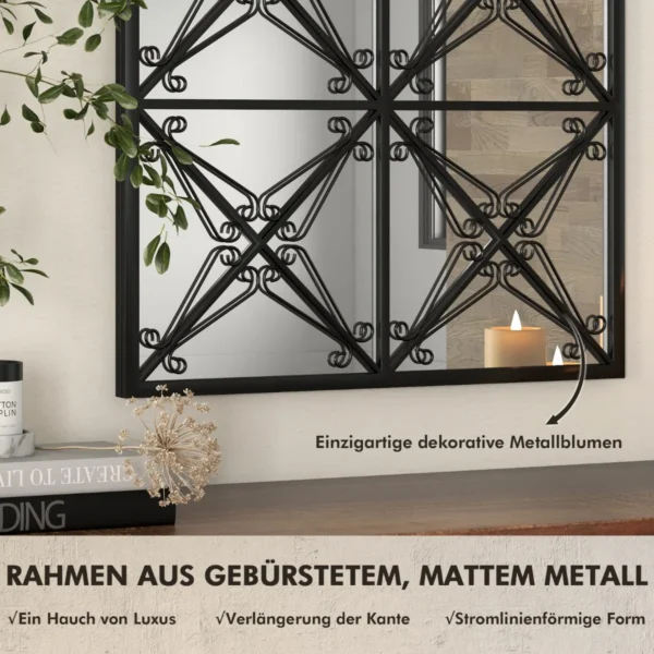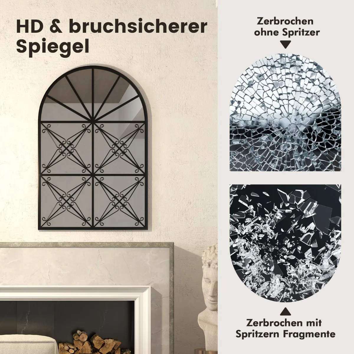 Sieninis veidrodis 58x87x2,5 cm, juodos spalvos, puikiai tiks jūsų namų interjerui. Šis arkinio lango stiliaus dekoratyvinis veidrodis ne tik papildo interjerą, bet ir vizualiai padidina erdvę, atspindėdamas daugiau šviesos. Juodas šlifuoto matinio metalo rėmas su metalinėmis gėlėmis suteikia unikalumo ir yra tvirtos konstrukcijos.