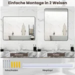 - Lanksčios tvirtinimo galimybės leidžia montuoti veidrodį horizontaliai arba vertikaliai pagal poreikį.