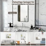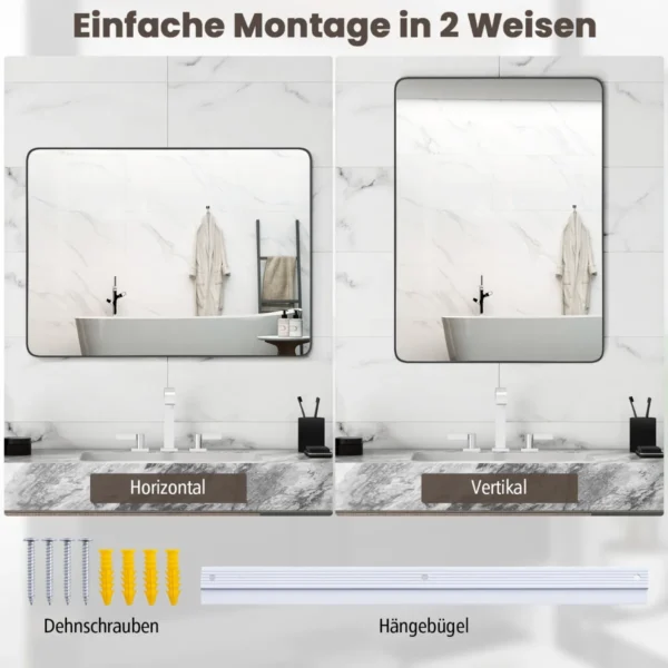- Veidrodis su aliuminio rėmu turi kabliukus ir išsiplėtimo varžtus saugiam pritvirtinimui prie sienos.