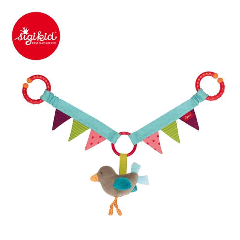 Minkšta grandinėlė vežimėliui, rekomenduojama vaikams nuo pirmųjų gyvenimo dienų. Grandinės viduryje įdedamas gražus pliušinis paukštis. Jos šonuose, iš mėlyno audinio, yra po tris spalvingus trikampius vimpelius.