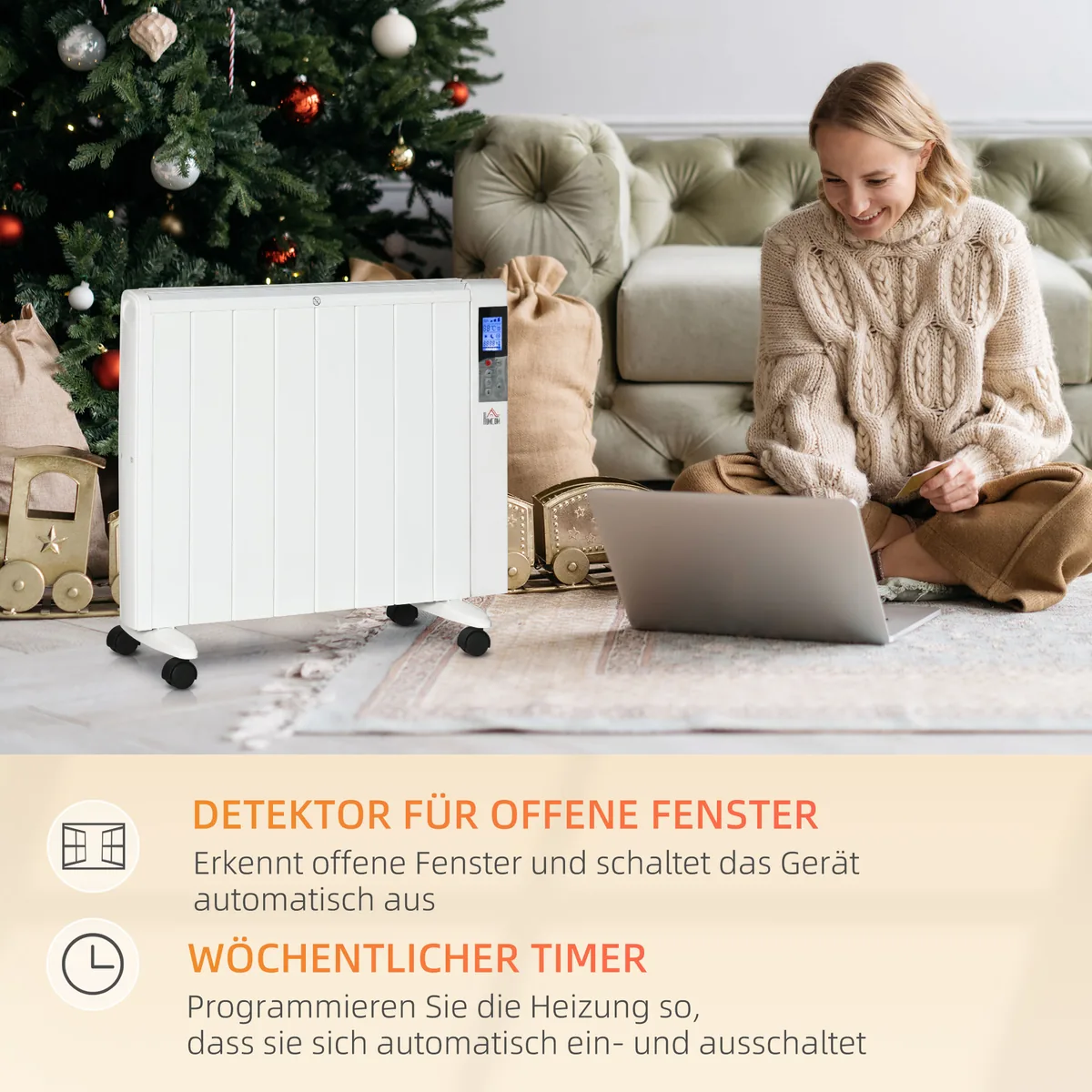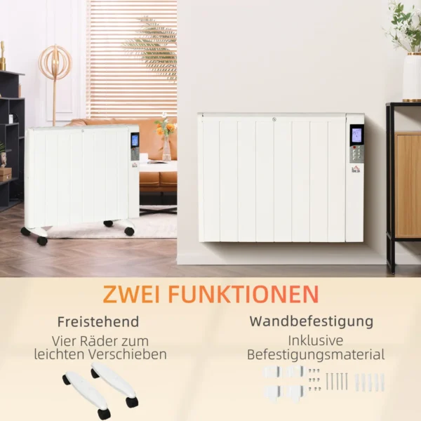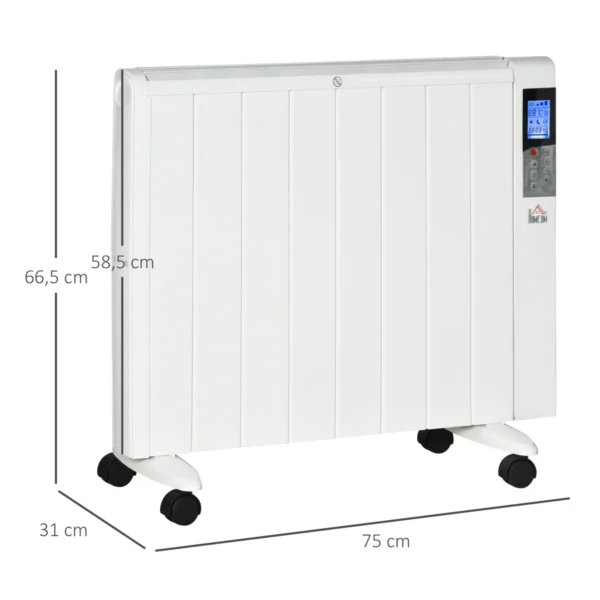 Patogiai sušildykite šį praktišką ir kompaktišką vertikalią HOMCOM radiatorių. Turi du šildymo lygius: žemą ir aukštą šildymo galią – idealiai tinka perėjimui iš rudens į žiemą. Pritvirtintų ratukų dėka, jei reikia, radiatorių galėsite lengvai perkelti arba tiesiog pritvirtinti prie sienos, kad sutaupytumėte vietos. Nustatykite temperatūrą tarp 5 ir 35° C, kad patogiai reguliuotumėte kambario orą pagal savo pageidavimus.