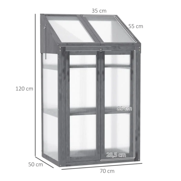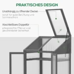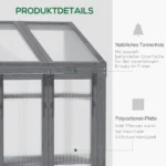 Mini šiltnamis Outsunny puikiai tinka augalų priežiūrai. Tvirtas pomidorų namelio eglės karkasas garantuoja stabilumą, o skaidraus polikarbonato plokštės užtikrina optimalų šviesos ir šilumos išlaikymą, idealiai tinka sėklų daigumui ar augalų apsaugai pasibaigus sezonui. Jame yra trys nuimamos lentynos, leidžiančios aiškiai išdėstyti augalus. Šiame šiltnamyje palaikoma ideali temperatūra sveikam augalų augimui.