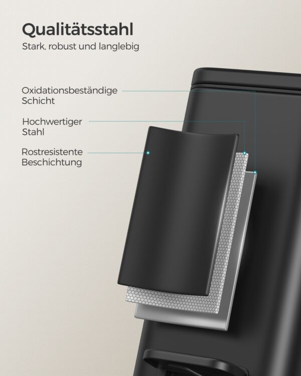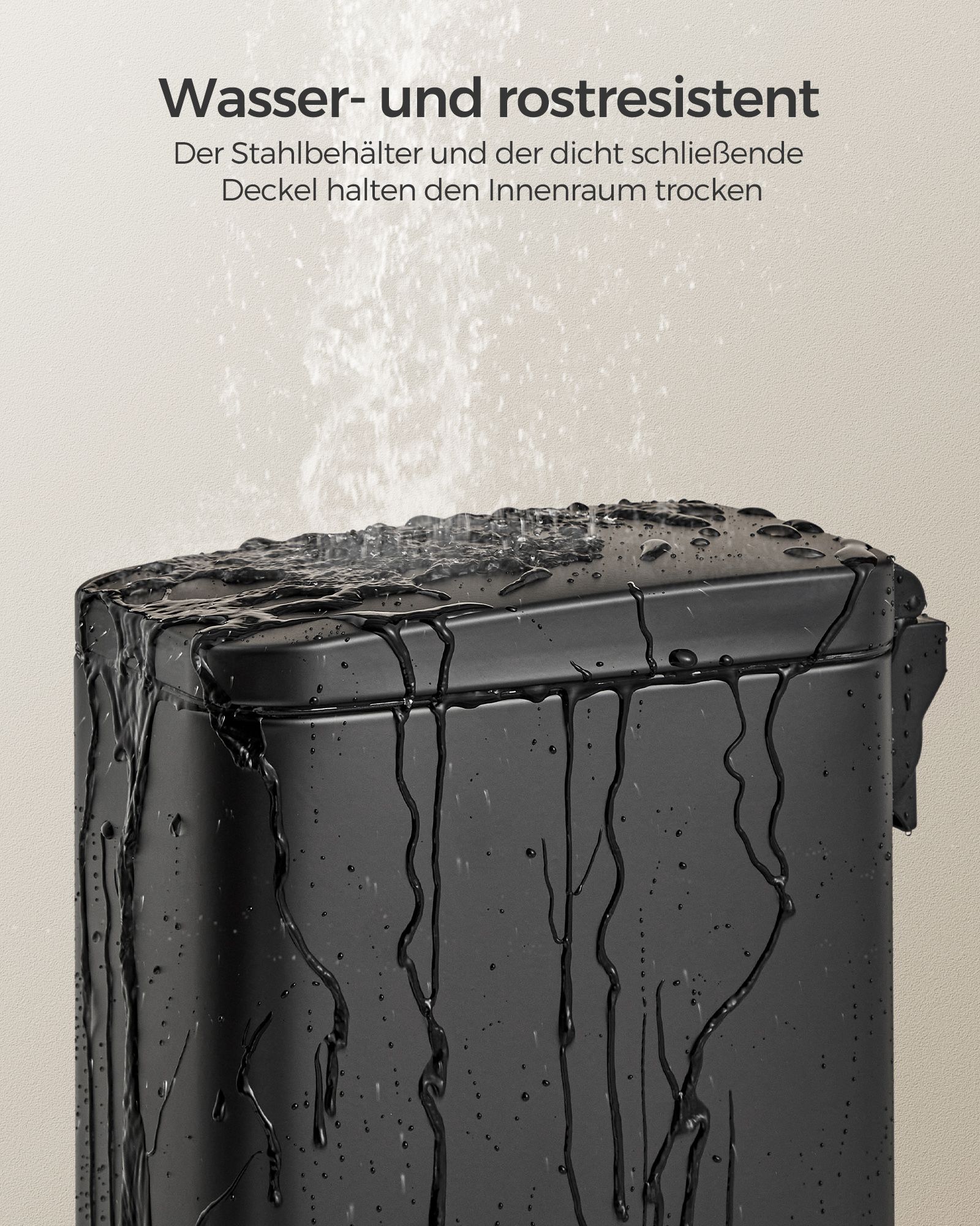 Pagaminta iš aukštos kokybės medžiagų: išorinis konteineris iš plieno, vidinis kibiras iš PP plastiko, o pagrindas iš ABS plastiko. Tai užtikrina tvirtumą ir ilgaamžiškumą.