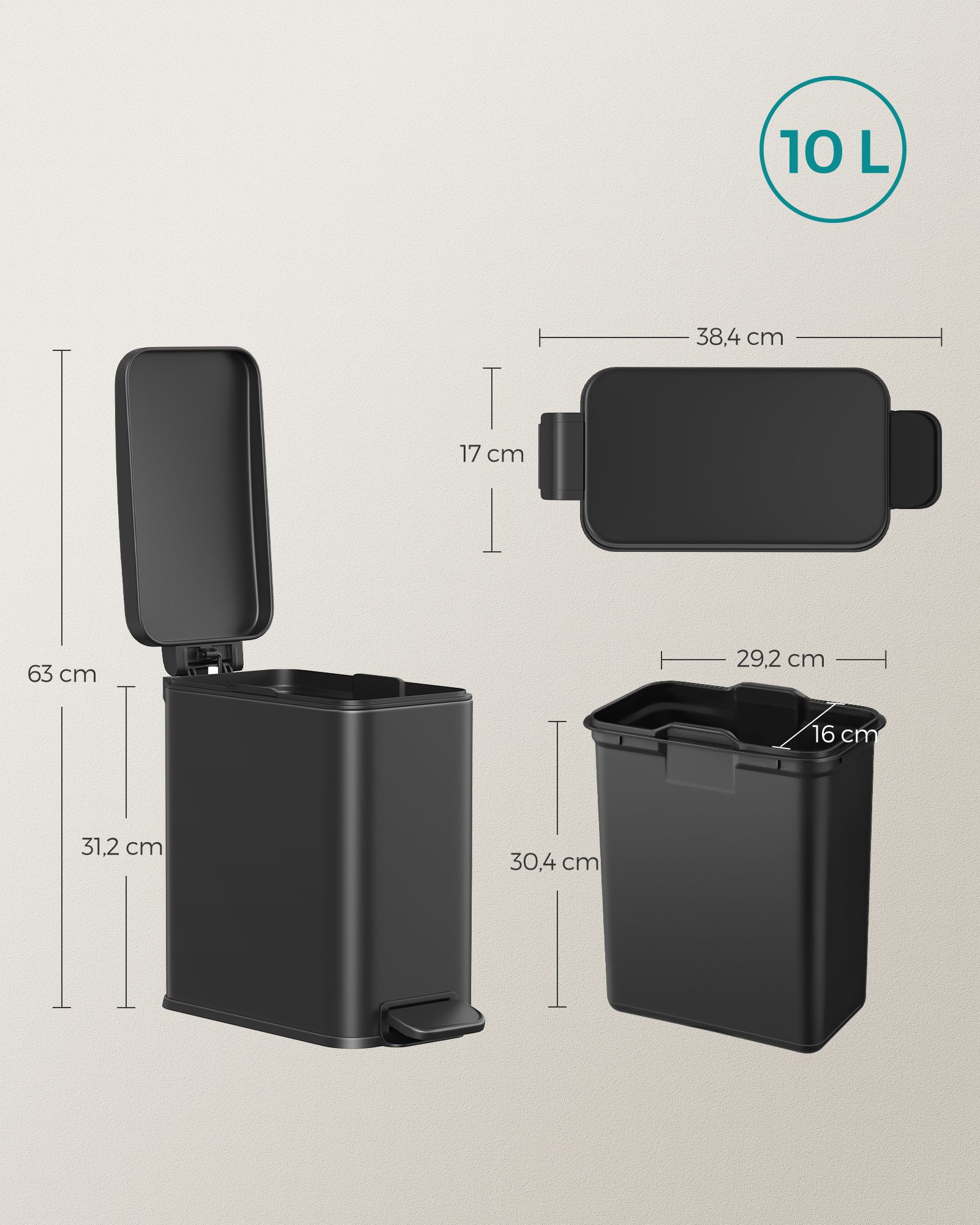 Bendras aukštis su atvertu dangčiu siekia 63 cm, o vidinio kibiro dydis yra 29,2 x 16 x 30,4 cm. Šiukšliadėžės talpa yra 10 litrų, o svoris – 1,9 kg, todėl ji yra lengvai pernešama ir patogi naudoti.