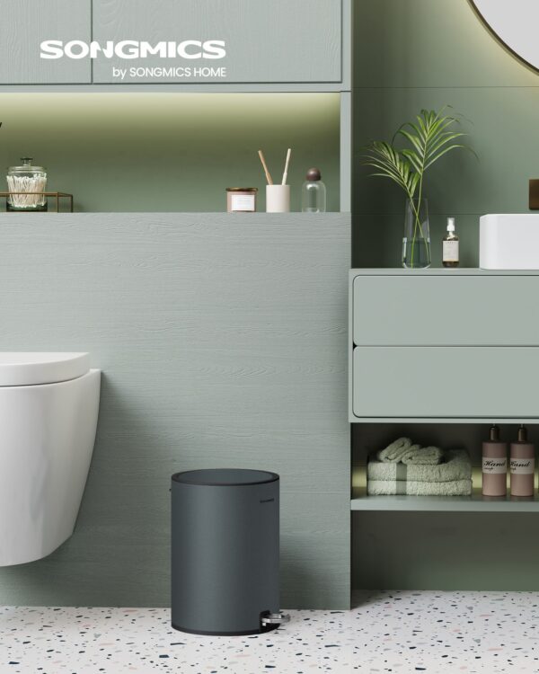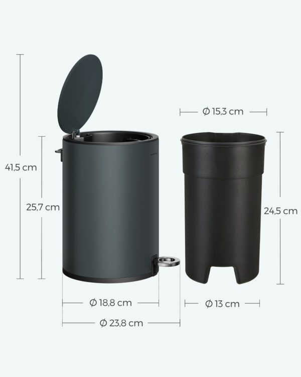 Ši tamsiai pilkos spalvos šiukšliadėžė yra ne tik praktiška, bet ir stilinga detalė, kuri puikiai derės prie bet kokio interjero.