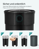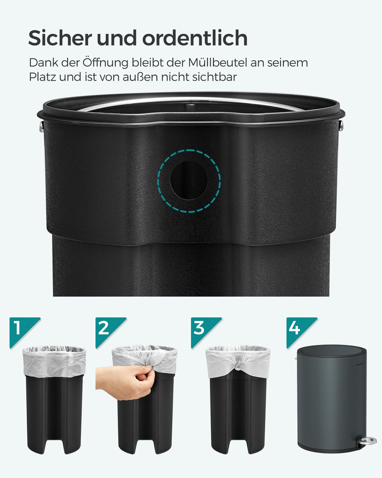 - Maišelio įtempimas: šiukšliadėžės maišelis išlaikomas įtemptas, kad jo nesimatytų iš išorės, užtikrinant tvarkingą išvaizdą.