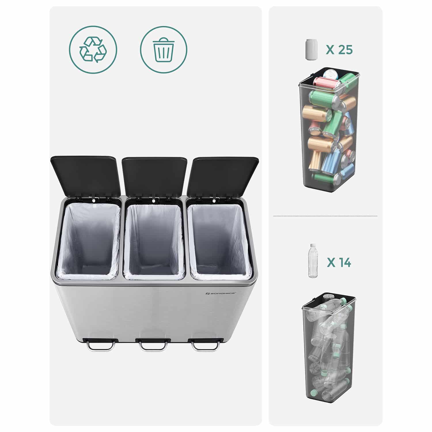Perdirbimas gali būti paprastas ir patogus: naudodami šią 54 litrų pedalo šiukšliadėžę su 3 atskirais skyriais, galite lengvai rūšiuoti atliekas, tokias kaip likutinės ir organinės atliekos. Tereikia paspausti pedalą ir išmesti atliekas į vidinę šiukšliadėžę. Jums net nereikia liesti šiukšliadėžės ranka, o tai užtikrina higieną.