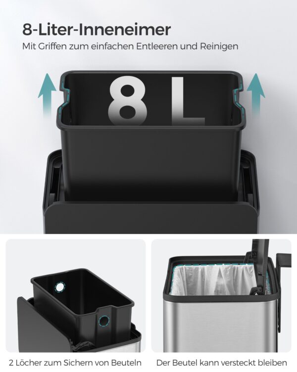 Pristatome elegantišką ir funkcionalią šiukšliadėžę, kuri puikiai tiks bet kurioje erdvėje. Ši 8 litrų talpos šiukšliadėžė yra ne tik praktiška, bet ir stilinga, todėl ji taps puikiu akcentu jūsų namuose ar biure.