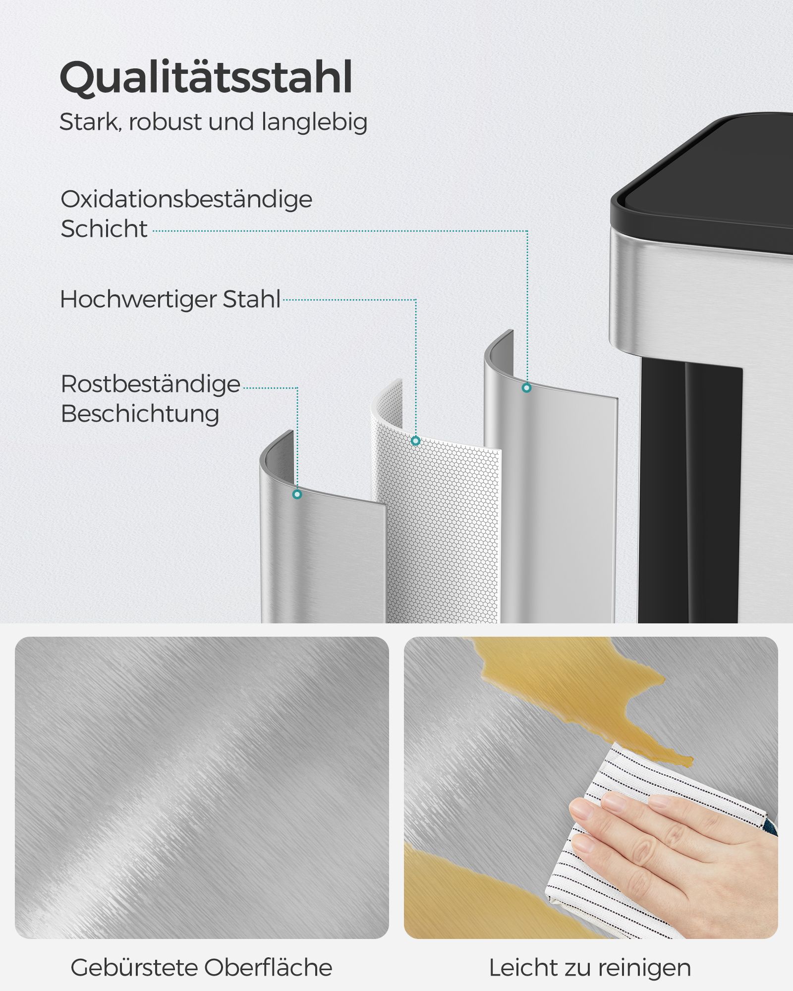 Šiukšliadėžė yra sukurta taip, kad būtų lengva naudoti ir prižiūrėti. Jos vidinis kibiras iš PP plastiko užtikrina patogų atliekų išmetimą ir valymą. Tvirta plieno konstrukcija suteikia ilgaamžiškumą, o elegantiškas dizainas – estetinį malonumą.