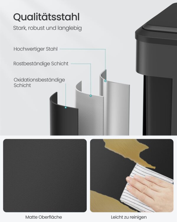 Pagaminta iš aukštos kokybės plieno, šiukšliadėžė yra tvirta ir ilgaamžė. Vidinis kibiras pagamintas iš PP plastiko, užtikrinančio lengvą valymą ir priežiūrą.