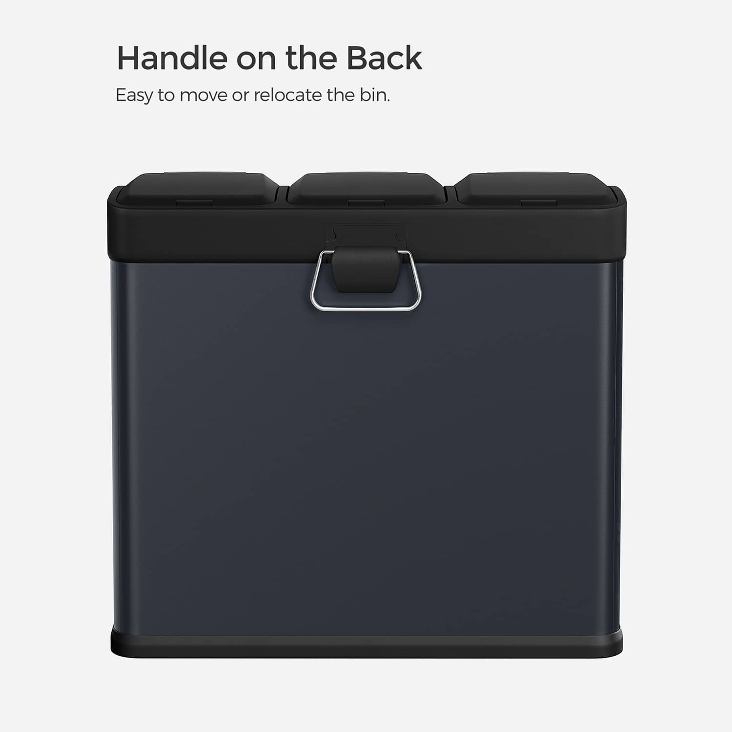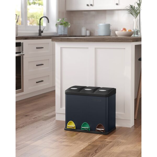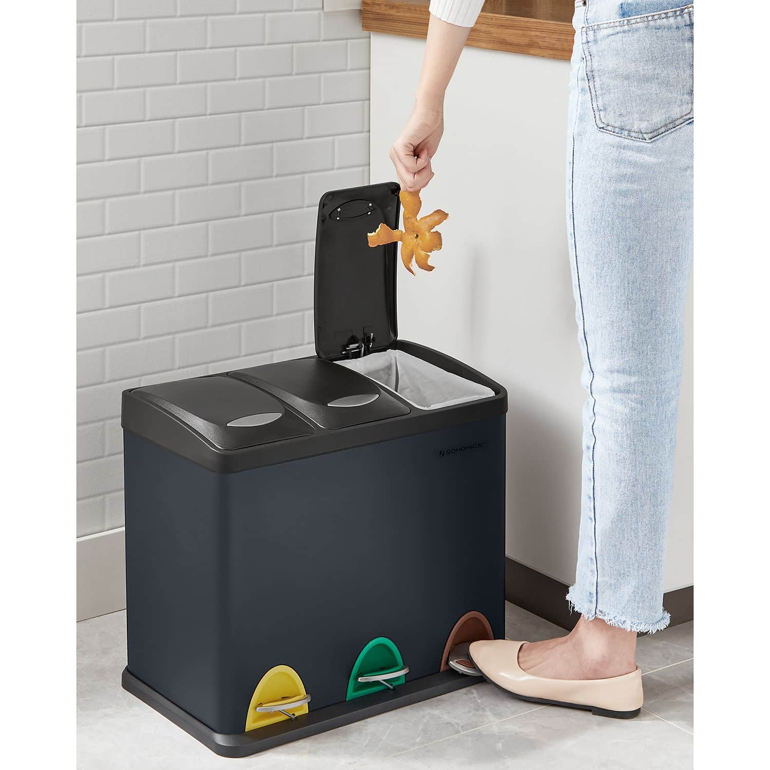 Perdirbti? Tikrai nesudėtinga! Naudodami šią pedalo šiukšliadėžę su 3 atskirais skyriais, galite lengvai rūšiuoti šiukšles, pvz., likučius ir organines atliekas. Tereikia paspausti pedalą ir išmesti atliekas į vidinę šiukšliadėžę. Jums net nereikia liesti šiukšliadėžės ranka, o tai užtikrina higieną.
