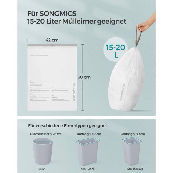 Šie šiukšlių maišai yra puikus pasirinkimas namų ūkiui ar biurui. Jie yra baltos spalvos ir turi užtraukiamas virveles, kurios užtikrina patogų ir saugų atliekų tvarkymą.