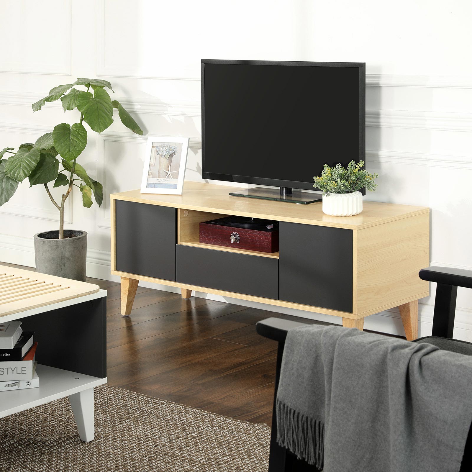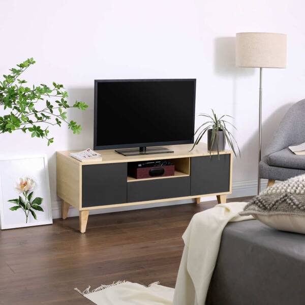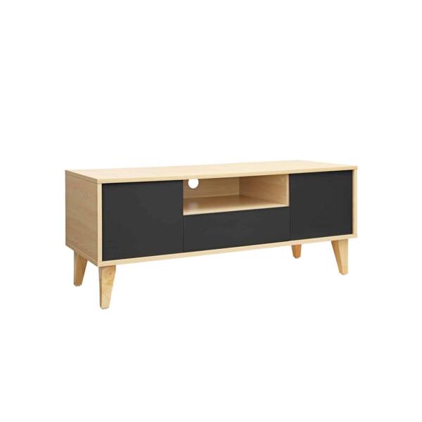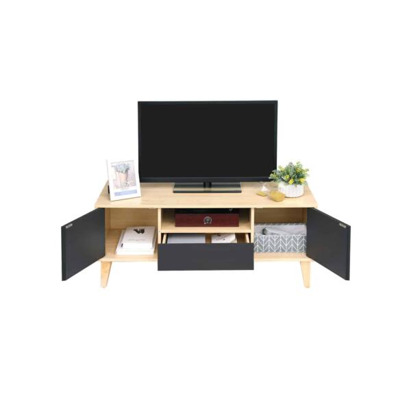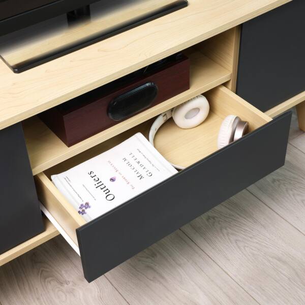 Viskas kontroliuojama. Dėl didelio stalviršio galite pastatyti tiek didelį televizorių, tiek mažesnį įrenginį, taip pat žvakes ir paveikslų rėmelius ant žemosios lentos. 2 mažos spintelės, stalčius ir atvira lentyna užtikrina, kad vieta aplink televizorių visada atrodytų tvarkinga.
